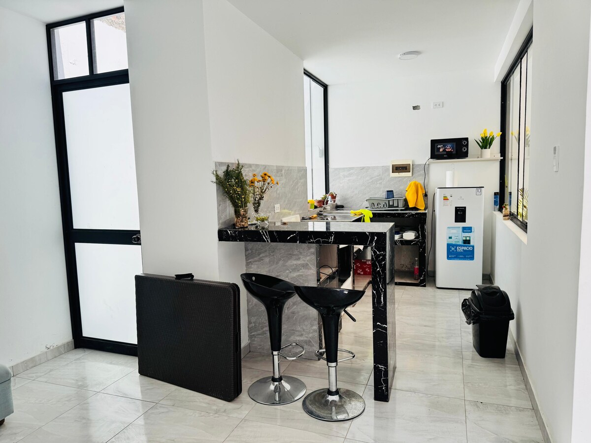 👋 Sunset Camaná ofrece studios y mini-apartamentos únicos para corta y larga estadía. 📍Ubicado a 500 metros del centro (6 mins), con tiendas, supermercados y farmacias a menos de 8 minutos a pie. Frente al alojamiento podrás disfrutar del parque con juegos y áreas deportivas. 🏠 Este studio cuenta con aire acondicionado, una kitchenette –equipada con frigobar y microondas– baño privado, ducha caliente, TV, cable y WiFi. ‼️ 🅿️ No contamos con estacionamiento.