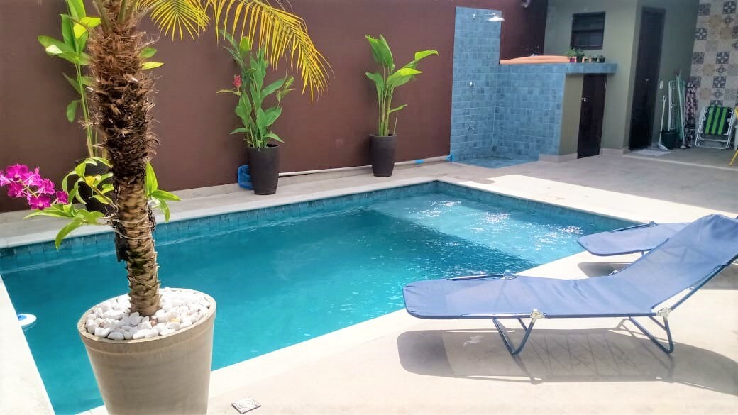 2 suítes e mezanino para 6 hospedes. Ar condicionado, Smart TV. Cozinha americana completa, varanda com rede e churrasqueira. Amplo gramado e estacionamento para 4 carros.Piscina privativa de 4X3 m., com espreguiçadeiras, mesas, cadeiras e guarda sol para refeições ao ar livre . Piscina protegida para segurança de crianças e pets.Taxa de R$250,00 para 2 pets. Podem ocorrer eventualmente falhas na internet, queda pontual de energia elétrica e barulhos de obras e outros nas vizinhancas