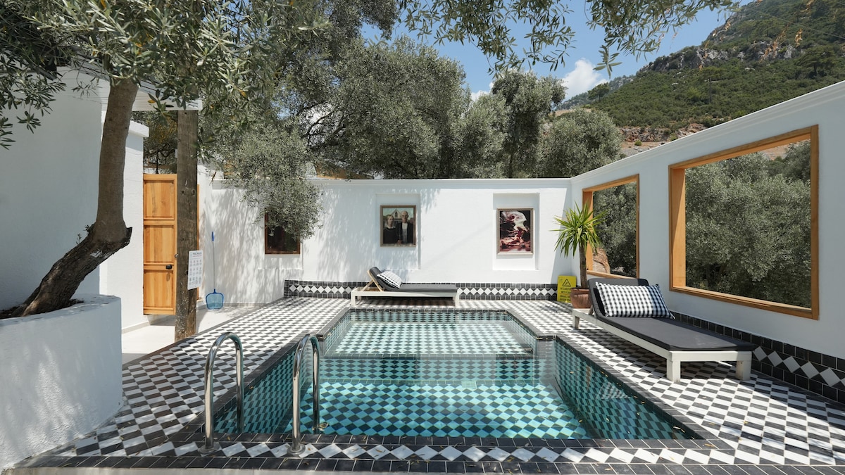 Pool House, 2 kişilik müstakil ve benzersiz bir evdir. Yuvarlak havuzu evin merkezindedir; yatağınızdan kalkıp birkaç adımda suya girebilir, film izlerken suyun içinde dinlenebilirsiniz. İçeride taş oyma yatak başı ve özgün tasarımlı bir banyo yer alır. Dış alanda dama desenli havuz, geniş özel bahçesinde konumlanır. Oyun meydanı ve sauna birkaç adım uzaklıktadır. Tesiste ortak havuz da mevcuttur. Alanda à la carte restoranımız hizmet vermektedir.