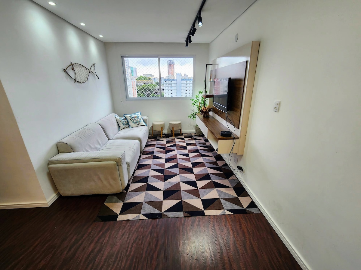 Ժամանակակից բնակարան Aparecida լողափում: Գերազանց տեղադրություն, շինություն լողափի դիմաց, 5 - րդ ալիքի բարերի և Praiamar առևտրի կենտրոնի հարևանությամբ ։ Բարձր հարկում, ծովի մասնակի տեսարանով, 3 պատշգամբում: Լավ կահավորված խոհանոց (գազի գրիլ, միկրոալիքային վառարան, էլեկտրական վառարան, կաթսա, գարեջրատուն, գինու մառան, սրճեփներ և ամանալվաց մեքենա): Սոցիալական լոգասենյակ ։ Լյուքս ՝ երկտեղանի մահճակալով, մրրիկով և լոգասենյակով ։ Ննջասենյակ ՝ 2 մեծ մեկտեղանի մահճակալով ։ Հասանելի է ներքնակ կամ բազմոց ։ Լվացք մեքենայով ։ Օդորակիչով ։