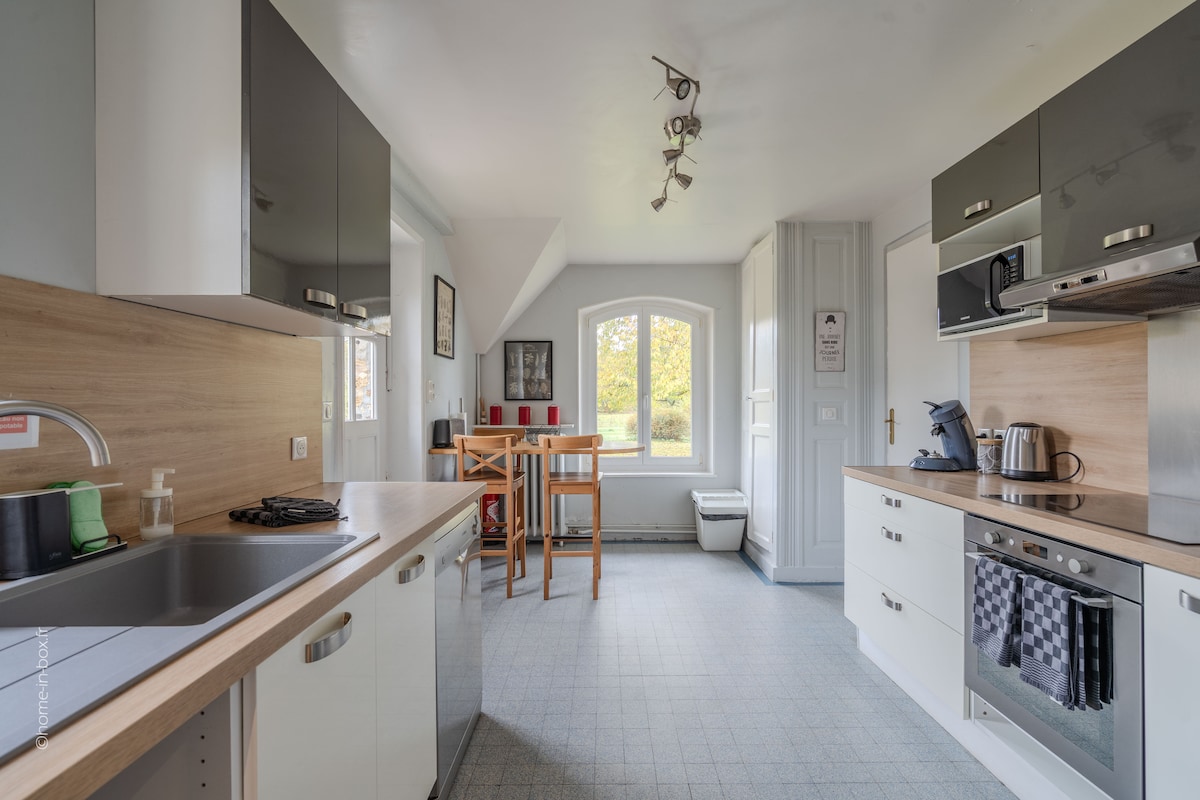 Բարձրակարգ լիովին վերանորոգված քոթեջ 18 - րդ դարի վերջից: 5 մեծ ննջասենյակ, լիովին կահավորված խոհանոց, մեծ ճաշասենյակ/հյուրասենյակ ՝ ներդիր բուխարիով, նրբաճաշակ 2 - րդ հարկի բնակելի տարածք բազմոցով, 75 դյույմանոց հեռուստացույց, փարոսբոլի սեղան (մանկական ոտք), գերարագ WI - FI (օպտիկամանրաթելային): Լիովին փակ հետնաբակ ՝ պատիոյի տարածքներով, բացօթյա նստատեղով, պինգ - պոնգի սեղանով և խորովածով ։ Շատ հանգիստ միջավայր ՝ ֆրանսիական գյուղական վայրերը վայելելու համար ։ Տնային կենդանիներ թույլատրվում են պայմանականորեն ։ Խնդրում ենք նախքան ամրագրումը կապվել այս մասին ։