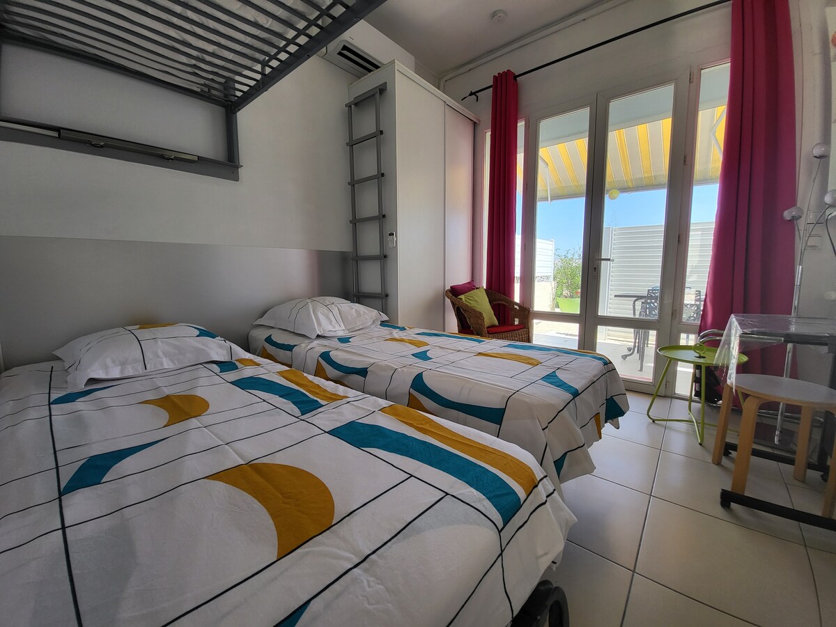 Gite T1 de 23 m2 situé au calme avec jardin 2 terrasses , parking fermé sous vidéosurveillance. De plein pied il comprend une chambre avec 2 lits simples , TV, salle d'eau fermée, WC , sèche serviettes. La climatisation reversible est dans la chambre. Le séjour central réunit une cuisine intégrée avec coin repas. Tous les commerces sont à proximité.