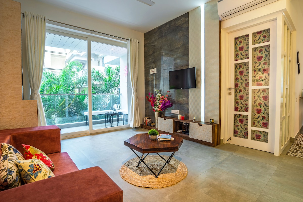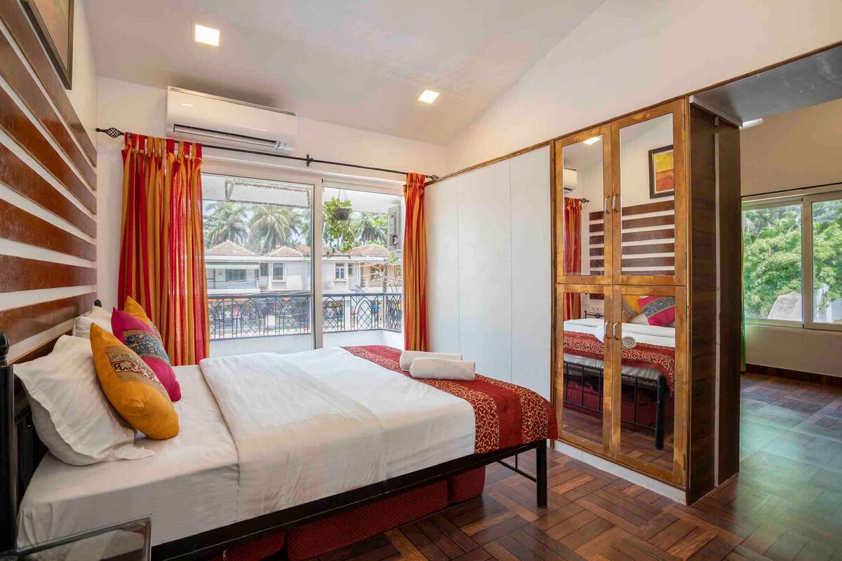 Modern Boho Apartment | Minutes from North Goa's Beaches.A cozy, fully furnished 1BHK retreat on ground floor perfect for couples, friends, or small families. Highlights: - Stylish boho interiors with a warm vibe - AC in bedroom & living room for comfort - Smart TV + High-speed WiFi - Equipped kitchen with RO water, cooktop, fridge & washing machine - Shared swimming pool (9 AM–6 PM | swimwear mandatory - On-site gym available at INR 200/-per person per day - 24/7 security - Free Parking