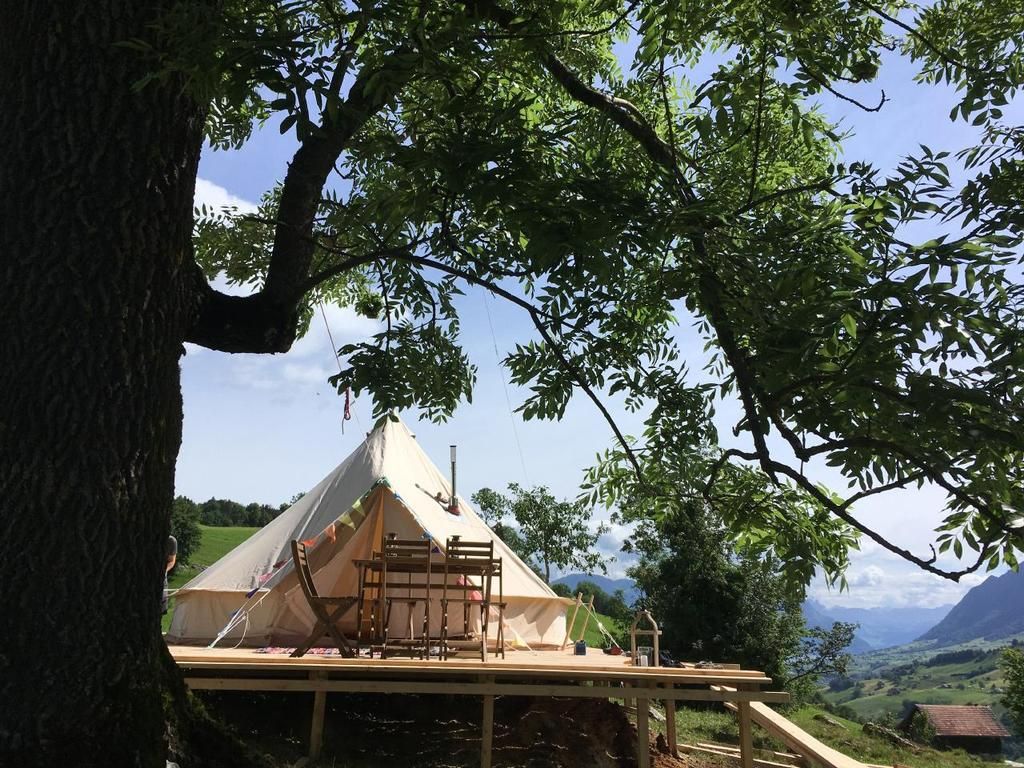 At "Adventure Farm Vorsäss," we offer unique tent experiences on the Mueterschwandenberg, Ennetmoos, surrounded by tree, mountain, lake, and cow. Our spacious cotton tents – perfect for families, couples, or groups – invite you for an unforgettable stay amidst nature. Available for a week or a tent weekend, you can book from July 1 to August 20 for a week, while on weekends, the tents are rented out for a minimum of two nights. Our location in a meadow promises an authentic experience in a hilly and rocky landscape. The amenities of our tents leave little to be desired: Whether for 4 people or groups up to 12 kids/4-6 adults/10 teenagers, we provide mattresses, pillows, a stove for cooking or heating, and more. Also available is a table that can be used both inside and outside the tent, as well as a box of kitchen utensils for up to 5 people. The stove ensures coziness, while a tent “under the ash tree” offers pleasant shade. A breakfast basket or fresh bread can be ordered daily, groups pay the same price as families but must bring their own sleeping arrangements. In addition to the tents, there is a small kitchen in the "Einfahr," table sets, and straw bales for lounging. Sanitary facilities range from outhouses “Into the Bush” to toilets “Into the Pot,” a drinking water dispenser, and a solar shower are available, as well as an outdoor shower with hot water and a shower for operational use inside the house. Lanterns and a battery spotlight provide lighting, while electronic devices can be charged at the sanitation facilities. A refrigerator for everyone is also available. Please bring sleeping bags, personal items, food, and drinks. Furthermore, there are exciting opportunities for activities on the farm and adventures in the nearby area, such as hiking, swimming in the lake, bike tours, and much more.