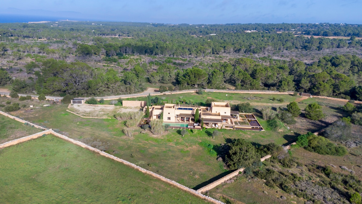 ET 6652 Esta hermosa villa de 300 m2 que se extiende majestuosamente sobre 15,000 m2 de terreno cercado. A tan solo 5 mins de la playa de Cala Saona. Con capacidad para 10 pax, alberga 8 habs. dobles y 5,5 baños, tres de ellos en suite, 6 con aire acondicionado y acceso directo al exterior. El corazón es su amplio salón, que conecta con la piscina y el jardín. Las 2 cocinas, completamente equipadas. Cuenta con una piscina, hamacas y camas balinesas, además de dos grandes porches.