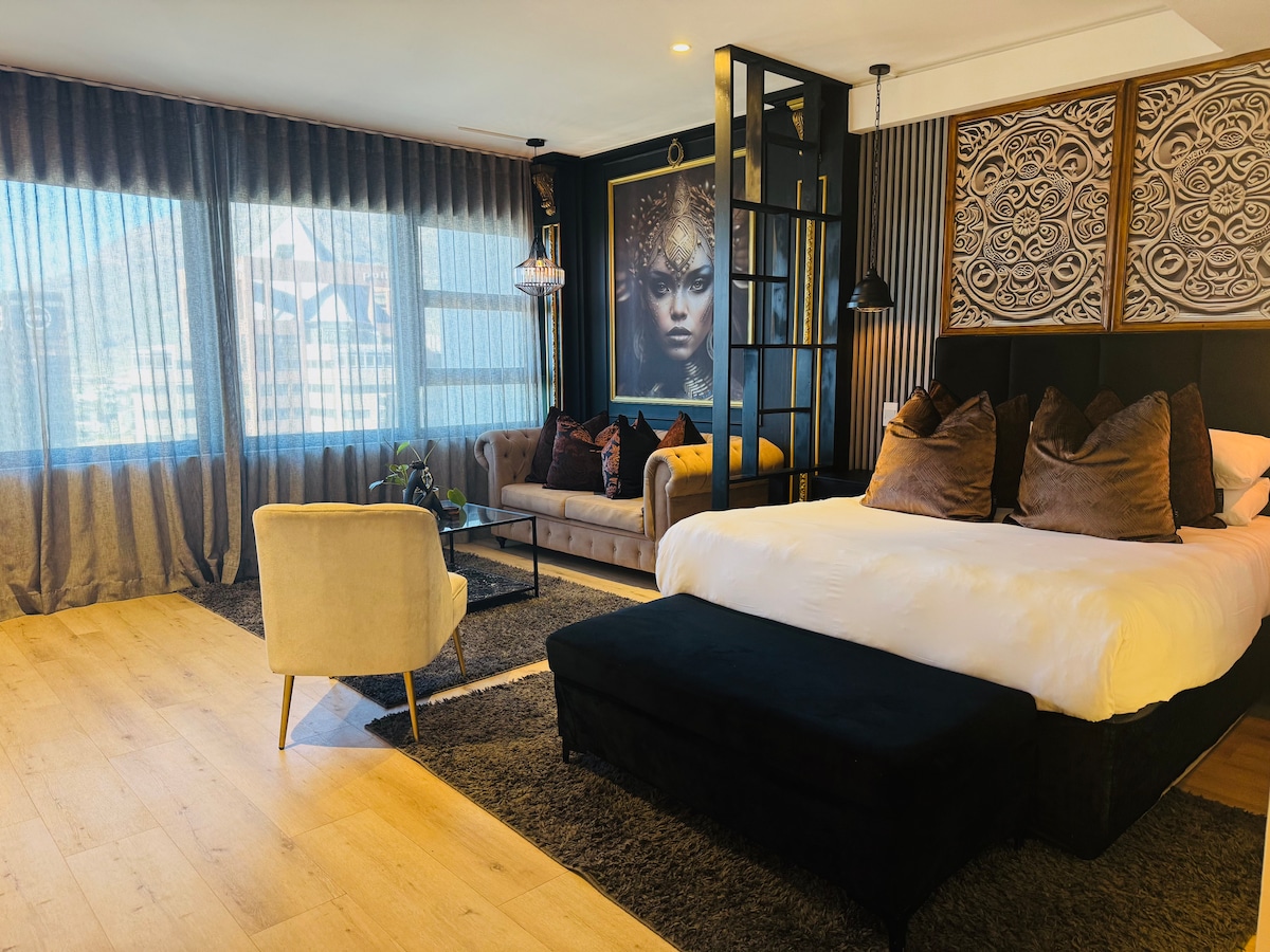 Welcome to The Sanctuary (Table mountain views) Colourful birds and deep emeralds immersive you upon entering this lush space. Fitted with the best linen and finishings to take your breath away. A fully equipped kitchenette is at your disposal. The lounge is perfect for those comfortable movie nights. In this space you will find a multi-purpose dining/work station below the 50” TV (fast and secure wifi) with a balcony overlooking Table Mountain.