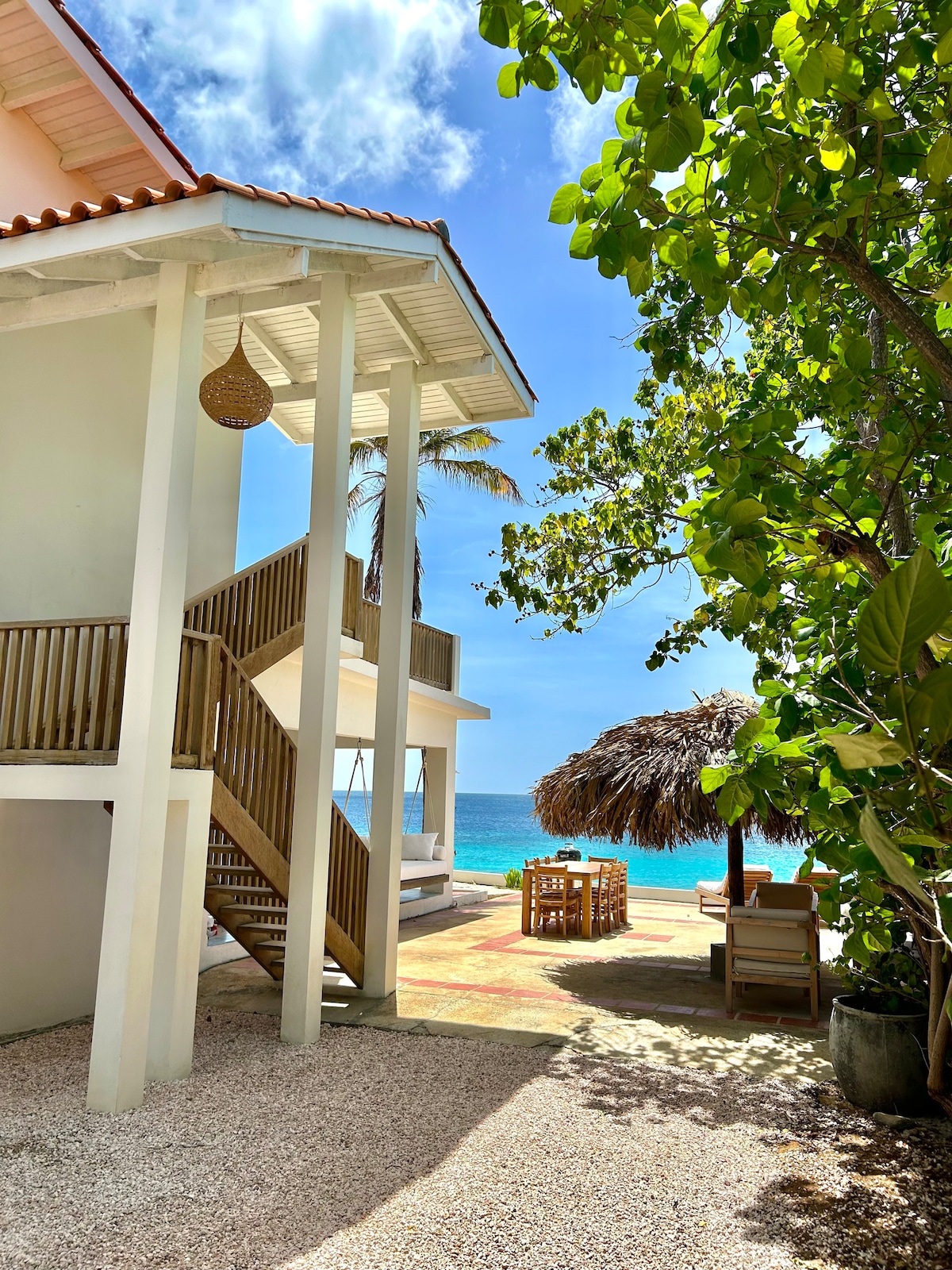 This cozy oceanfront villa is located right on the Caribbean Sea in the upscale Sabadeco area. Its one-in-a-million location offers direct ocean access—jump in and snorkel or dive with turtles, eagle rays, and parrotfish right in front of your villa. Or unwind in the double swing chair, sipping wine while waiting for the ‘Green Flash.’ During Christmas and New Year, a 14-night minimum stay applies, with fixed holiday rates. For more information, feel free to contact us.