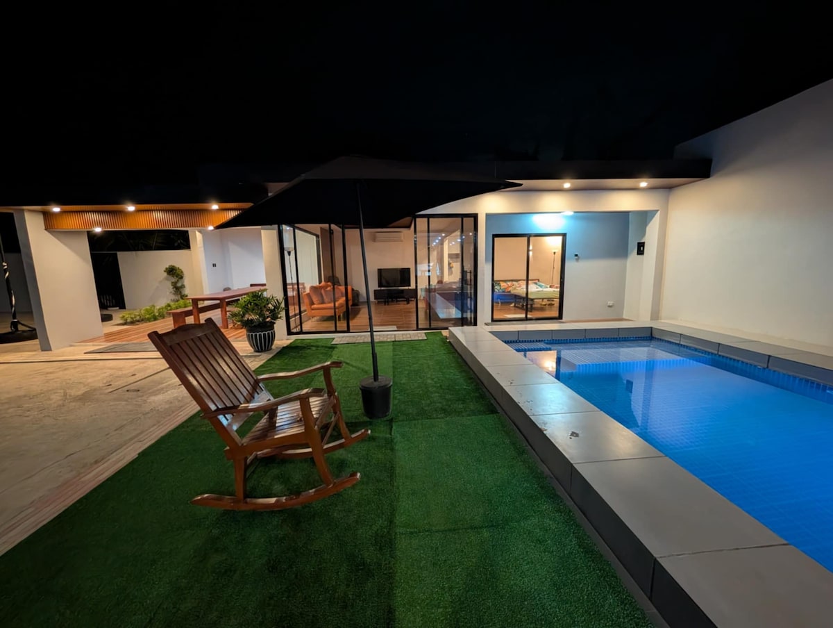Հանգիստ եղեք Տագայտայի սրտում գտնվող եռանկյունաձև վիլլայում ։ Արթնացեք ցնցող շրջակայքում ՝ IG - ի արժանի այգով և ինտերիերի նրբագեղ դեկորով, որը, անկասկած, տպավորություն կթողնի ։ Ընկղմվեք շքեղ հարմարությունների մեջ, ինչպիսիք են մասնավոր լողավազանը և ջակուզիները, որոնք կատարյալ են ընտանիքների և խմբերի համար ։ Ջեռուցվող լողավազանը և ջակուզիները հասանելի են լրացուցիչ վճարով ։ Wi - Fi - ն աշխատում է Starlink գերարագ ինտերնետով ։