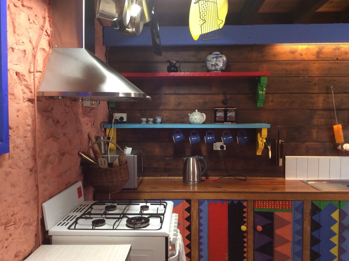 Set among an abundant and lively garden, The Barn is our fully detached, unique guest house. The building was originally a fully functional blue stone farm barn but since owning the property we have converted the space into an open plan house, complete with kitchen, bathroom, large living area and two mezzanine bedrooms. The outside remains in its original state while the inside has been decorated with a collection of artwork and objects from our travels overseas.