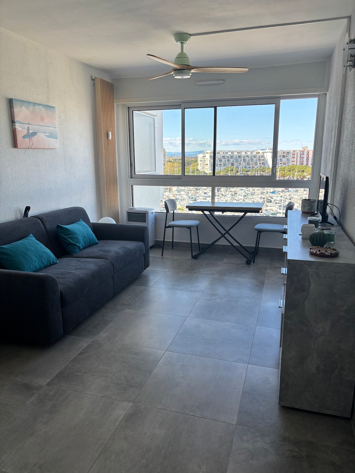 Emplacement idéal sur le Port de Carnon, à 5-10 minutes à pied de la plage. A 5 min en voiture du parc des expositions de Montpellier et de l’Arena Studio entièrement rénové et équipé : vous n'aurez plus qu'à amener vos valises. Il offre une superbe vue dégagée de Montpellier à La Grande Motte, sur le Pic Saint Loup, les étangs et le canal. 🚙 Parking payant dans la rue dès le 1er mai