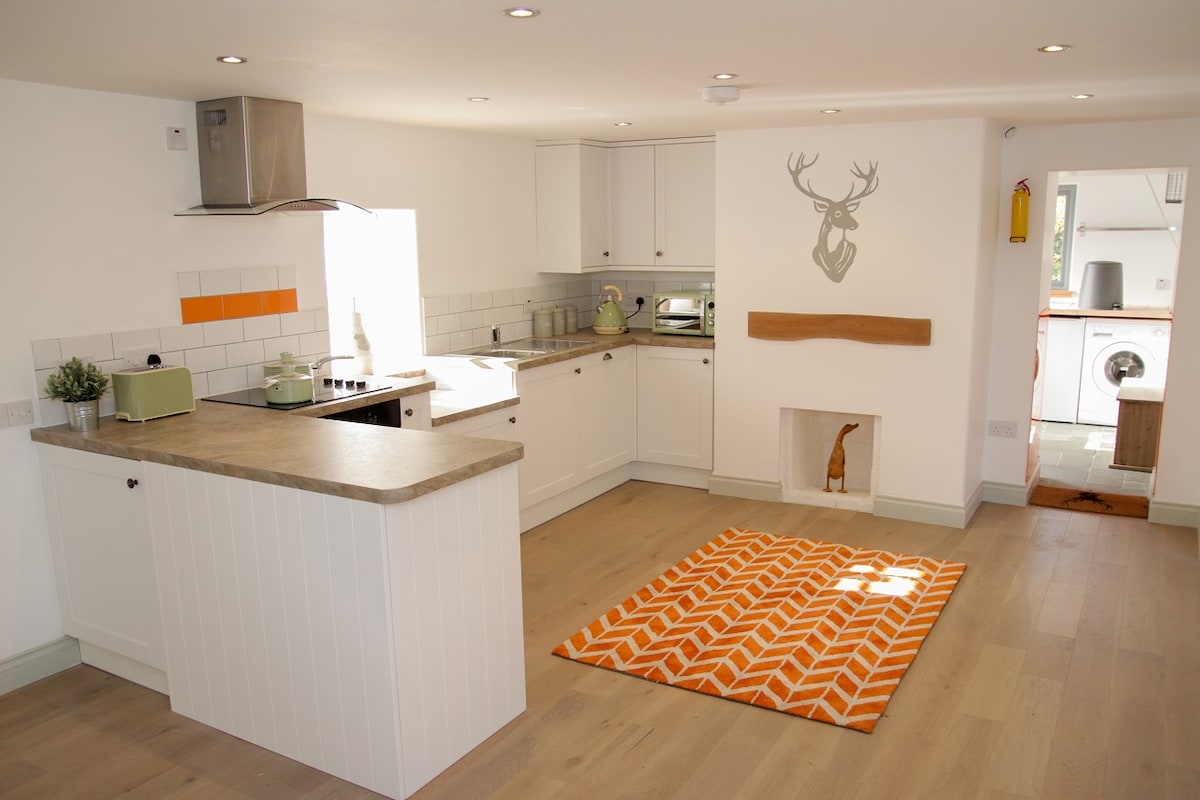 Our cosy, modern 2 bedroom end-terrace cottage, is just off the High Street in Grantown on Spey. Private off-street parking and private garden. Downstairs is a fully equipped kitchen with a table and four chairs, a shower room/toilet and a living room with a large, comfortable corner sofa and TV with Freeview channels. There is also a lovely electric fireplace. Upstairs there are two bedrooms; one with a king bed and one with two single beds. On the landing, there is an office desk and chair.
