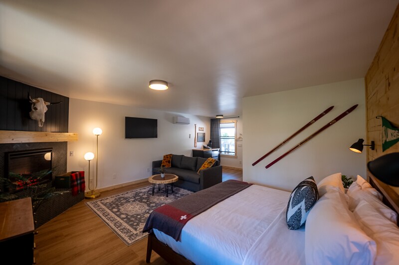 Մեր King Suite - ն ունի սեփականության ԼԱՎԱԳՈՒՅՆ լճի տեսարանը: Կարելի է տեսնել մղոններով դեպի հակառակ ափը ՝ շրջապատված լեռնային տեղանքով ։ Այն ունի դարի կեսերի ժամանակակից դեկոր, այդ թվում ՝ երաժշտության թեմաներով պատի արվեստ, Fender Stratocaster կիթառ և Spark amp ՝ այդքան հակվածների համար ։ Հարմարավետ մինչև 50 դյույմանոց սմարթ հեռուստացույց ՝ Klipsch ձայնային համակարգով և էլեկտրական բուխարիով ՝ ամբողջ տարվա ընթացքում ։ Ուղիղ հեռուստացույցը, գերարագ ինտերնետը և DVD - ի ընդարձակ գրադարանը երաշխավորում են, որ երբեք չեք ձանձրանա ։ Այս առանձնաբաժինն ունի ամբողջական խոհանոց: