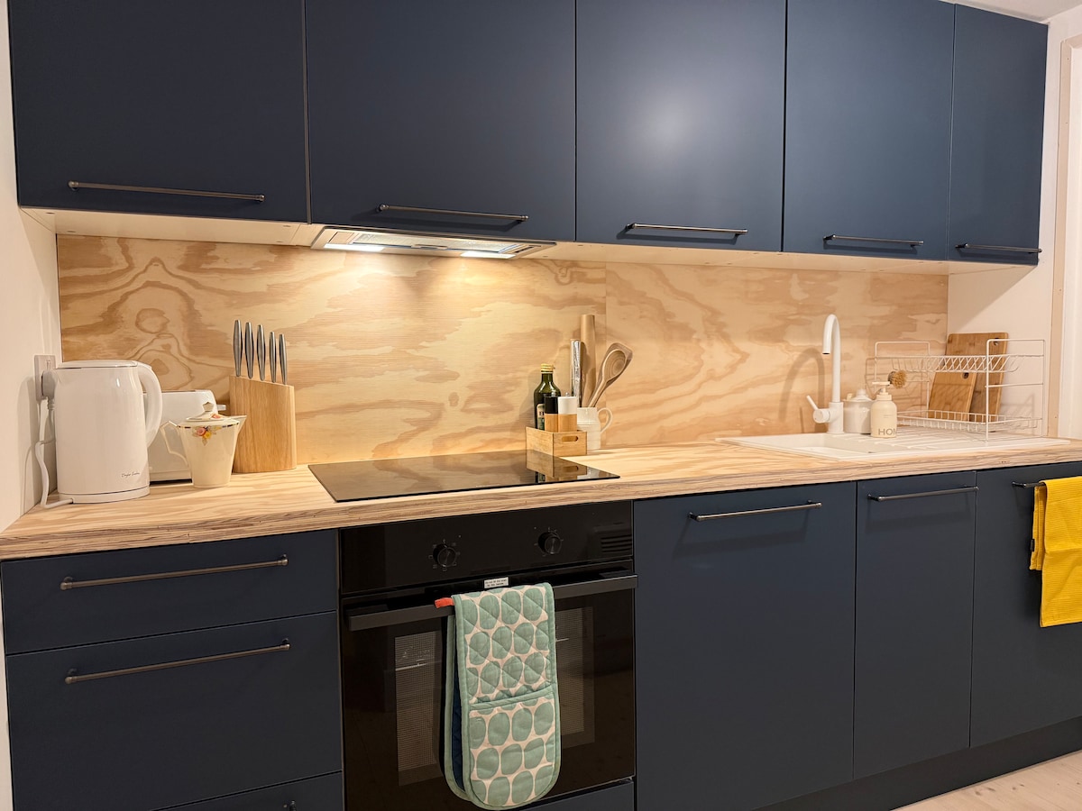 Wrens nest is a cozy one-room cottage with an open plan design that combines charm with functionality. The main room features a simple layout where the bed, sofa and kitchen area share the same space. The comfortable oak framed bed has neutral linens and bedside tables with reading lamps. The two seater sofa has small foldable tables for dining. The kitchen occupies one wall with simple cabinets, two burner hob, fridge, microwave and small air fryer. The shower room has wc & sink with storage.