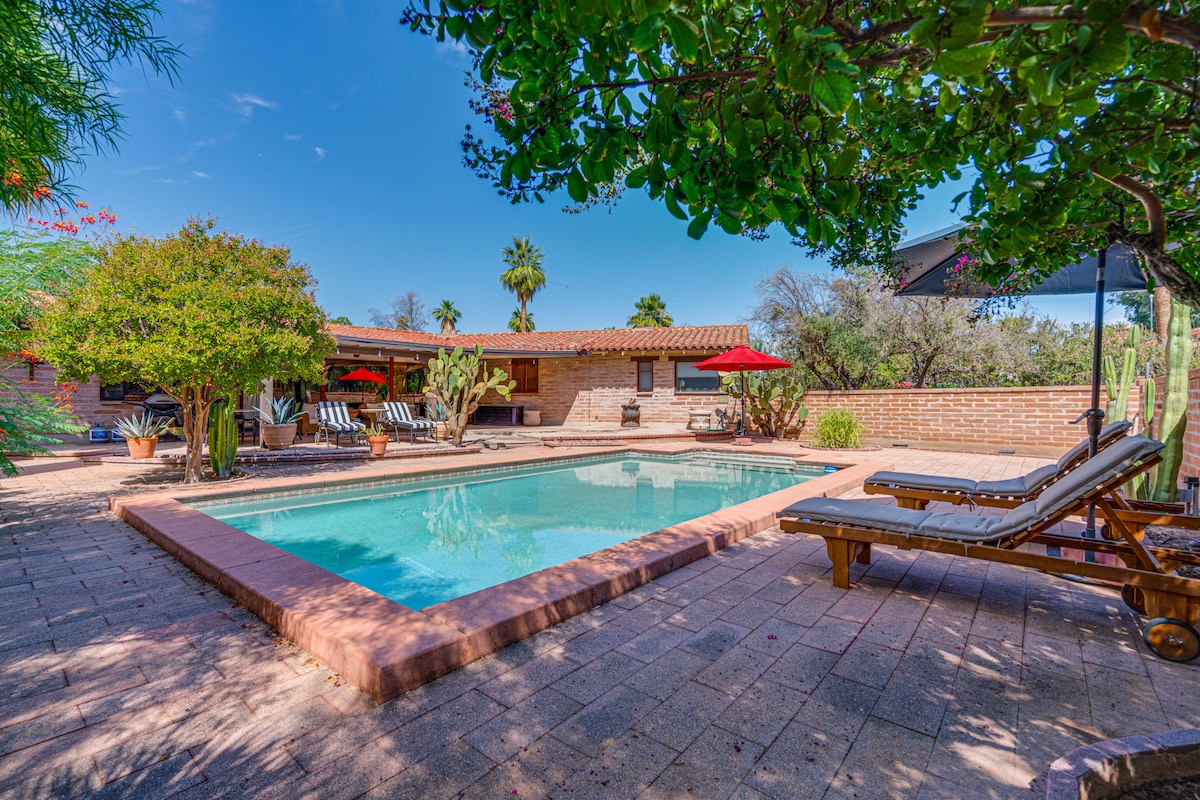 Թաքնված գոհար Թուսոնում ։ Տունը դասական ադոբե ոճի Սանտա Ֆե ոճի տուն է ։ Վայելեք տան բոլոր հարմարությունները, հանգստացեք գեղեցիկ, մեկուսի, ամբողջովին ցանկապատված հետնաբակում ՝ առանձին ջակուզիով և լողավազանով: Ճաշասենյակը կարող է տեղավորվել մինչև 8 հոգու համար, խոհանոցը լիովին համալրված է հիմնական պարագաներով: Կա փոքր և ֆունկցիոնալ գրասենյակային տարածք ՝ տպիչով և թղթով, և լվացքասենյակ ։ Կա 3 հարմարավետ ննջասենյակ ՝ սմարթ հեռուստացույցներով, արագ ինտերնետով, բարձրորակ անկողնային պարագաներով և առաստաղի օդափոխիչներով ։