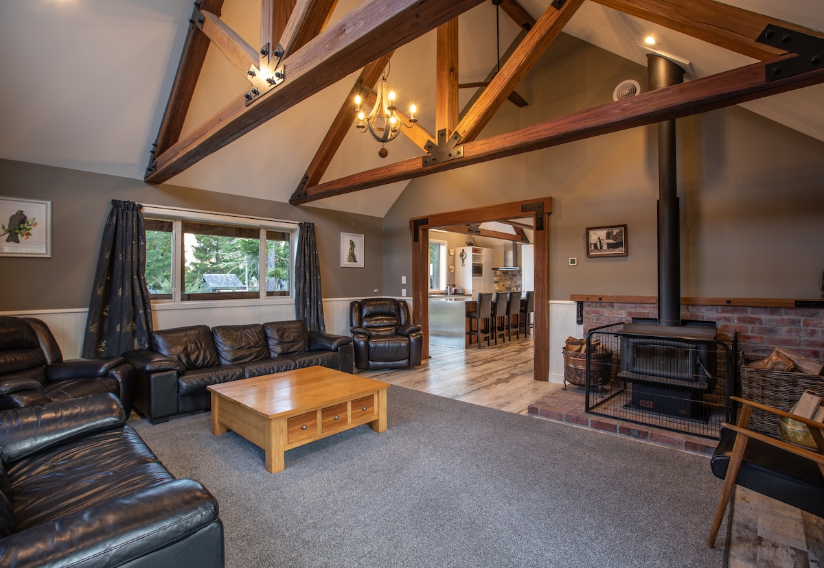 This character‑filled home features cathedral ceilings with exposed, hand‑planed hardwood beams. Generous living spaces are bathed in natural light and fabulous views. The home offers 3 double bedrooms plus a large bunk room, making it ideal for family groups. There are 2 bathrooms: 1 with a claw‑foot bath, separate shower, vanity and separate toilet, and the other with a shower and toilet for added convenience. Both the bunk room and lounge are equipped with TVs, providing spaces for relaxation