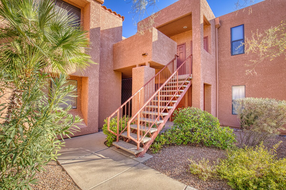 This upstairs condo offers the feeling of seclusion with fantastic amenities. Everything you need is here! Walk up your private staircase and enter an updated southwest-style abode oasis, with loads of natural light, private lanai, and views of the nearby mountains, desert, and city lights. Fully furnished, perfect for a long-term vacation. The kitchen is fully stocked with everything you need to cook a delicious meal. The community features 2 pools/spas, a fitness center, and a tennis court.