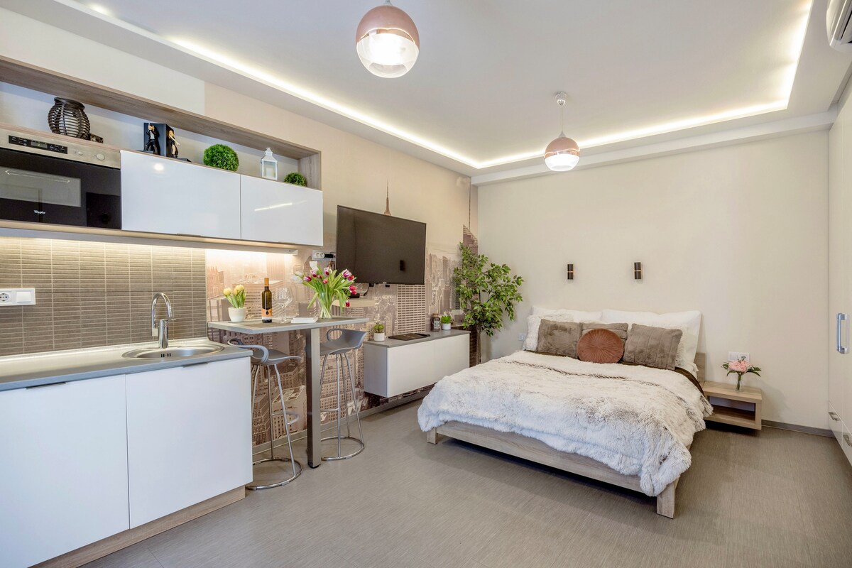Pleasant, quiet, well-equipped fashioned studio apartment (35 sqm) for 2 people in the centre of Buda. Everything is within reach: ALLEE MALL, cinema, pharmacy, grocery store, restaurants, cafes, bank, currency exchange, Gellért Hill, Statue of Liberty, Gellért bath. The apartment has: oven, microwave, hob, fridge, kettle, smart TV, NETFLIX, WIFI, towels, bed linen, washing machine, AC. Our apartment works with a code, so you can enter independently at any time during your reservation.