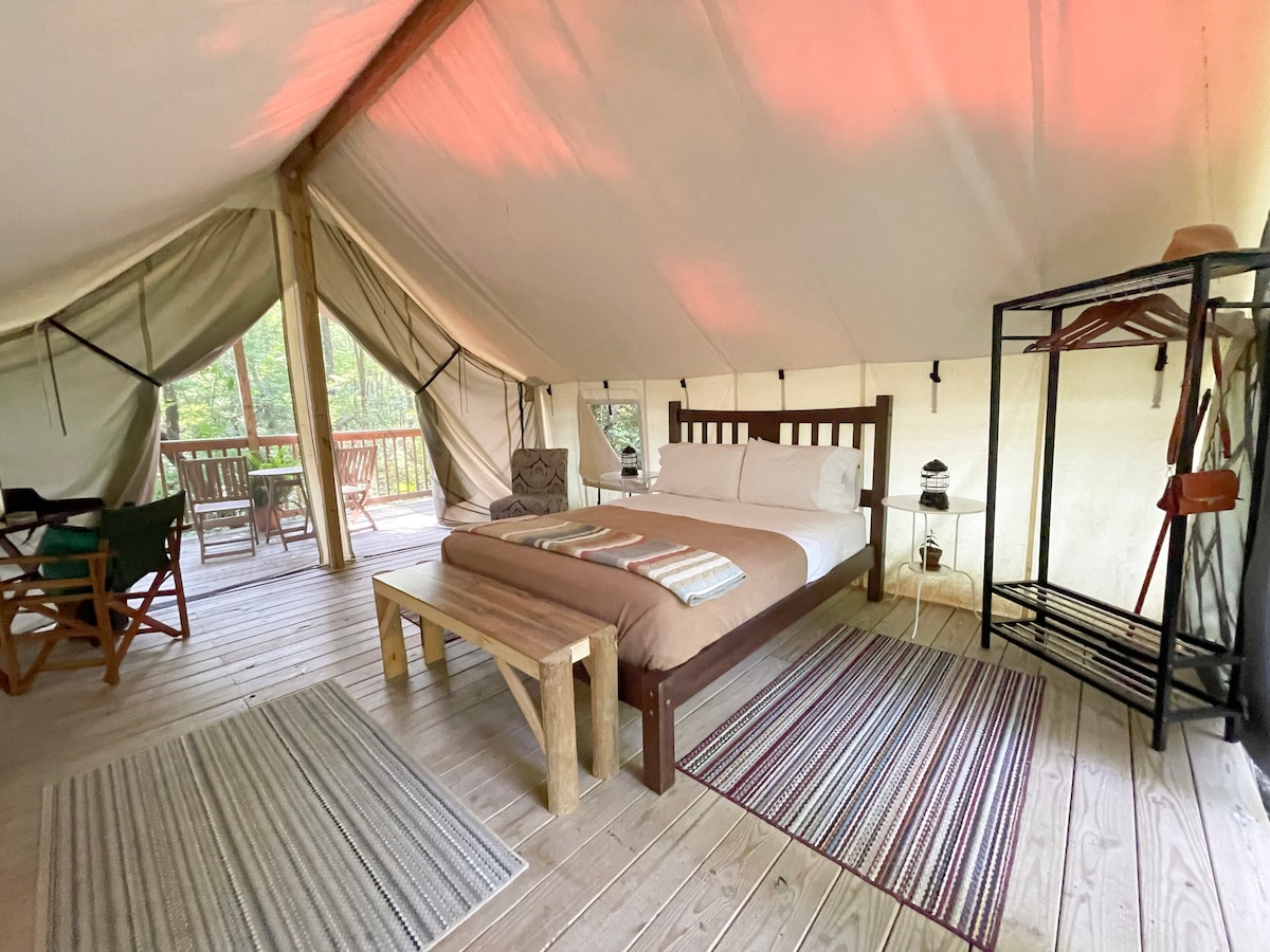 At the edge of a wildflower meadow with mountain views, this beautifully furnished glamping tent has two queen beds, front porch and private rear deck. Each of our four tents has a kitchenette in the Lodge. Sweet new Bath House. Enjoy wood-fired pizza (most but not all nights) and our new all natural wood hot tub (booked for private experience for $25) . 40 acres of meadows, woods, pond, streams and trails. Nightly bonfires and star gazing, a nearby lake and rafting in the Hudson River.
