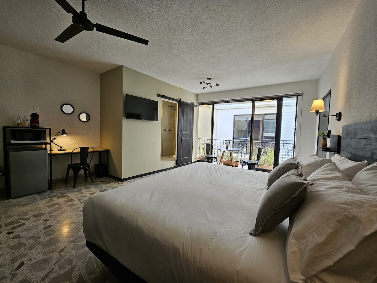 We invite you to experience comfort and privacy in our rustic-modern Studio! Integrated within an old mansion in the historic center of Querétaro, just a few blocks away from the cathedral and the historic Teatro de la República, our location is privileged in the heart of the city, in a peaceful area away from nighttime noise. Come and enjoy an unforgettable stay!