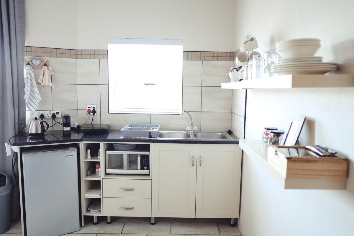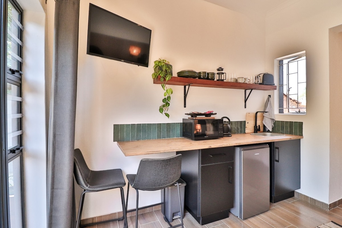 Enjoy a stylish experience at this centrally-located place, nestled in tranquil surroundings. The room boasts a Queen size bed with electric blanket, chairs and kitchenette, with microwave, fridge, toaster and cutlery. etc. Coffee and tea amenities. Smart TV with Netflix, wi-fi and workstation. Bathroom with shower. Towels and bathroom amenities provided. Patio with chairs. Safe parking next to entrance. Close to golf course, shopping centre and heritage sites. Easy access from N14, R101 & M10.