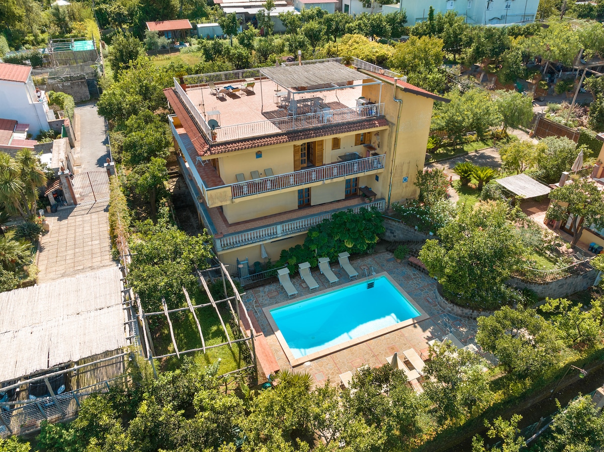 Appartamento situato in un'azienda agricola, immerso in un esteso agrumeto biologico dove si può passeggiare, con terrazzo e vista panoramica sul golfo di Napoli; dotato di tutti i confort e ottima ubicazione per raggiungere facilmente il mare, il centro e la costiera Amalfitana. E' consigliato l'uso dell'auto in quanto la struttura dispone di parcheggio privato esclusivo sito davanti all'ingresso dell'appartamento. Tassa di soggiorno da pagare in loco euro 4,00 a notte per le prime 7 notti.