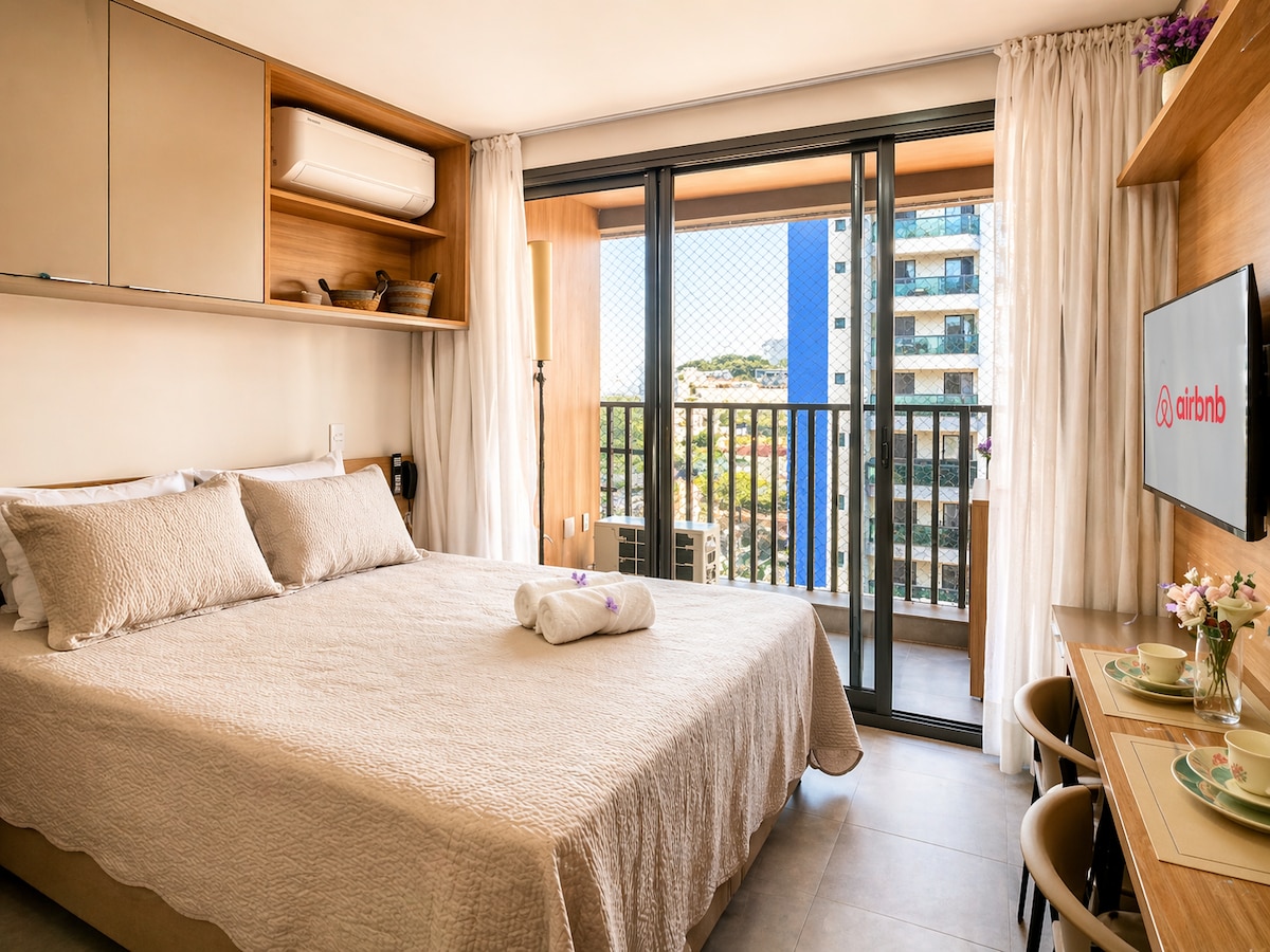 Experimente a estadia em um estúdio moderno e acolhedor, totalmente mobiliado e equipado com enxoval completo e utensílios de cozinha. *ESTACIONAMENTO*: NÃO POSSUIMOS VAGAS. Nas proximidades existem estacionamentos 24h. *FLEXIBILIDADE DE HORÁRIOS*: Conseguimos flexibilizar os horários mediante disponibilidade. *LOCAL*: Próximo ao shopping Anália Franco. Mercados, Farmácias, Hospitais ao redor e fácil acesso as principais avenidas e eventos da cidade!