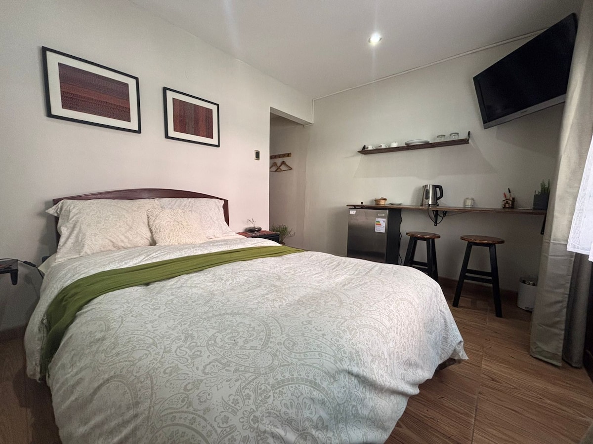 Disfruta de la sencillez de este alojamiento tranquilo y céntrico. Departamento independiente a dos cuadras de la plaza de armas en 2do piso con vista a la calle principal. Cuenta con 1 cama king, tv, cable, wifi. Cerca a iglesias importantes de la ciudad, atractivos turísticos, bares, restaurantes, bodegas, panaderías, farmacias. Centros comerciales a diez minutos en taxi.