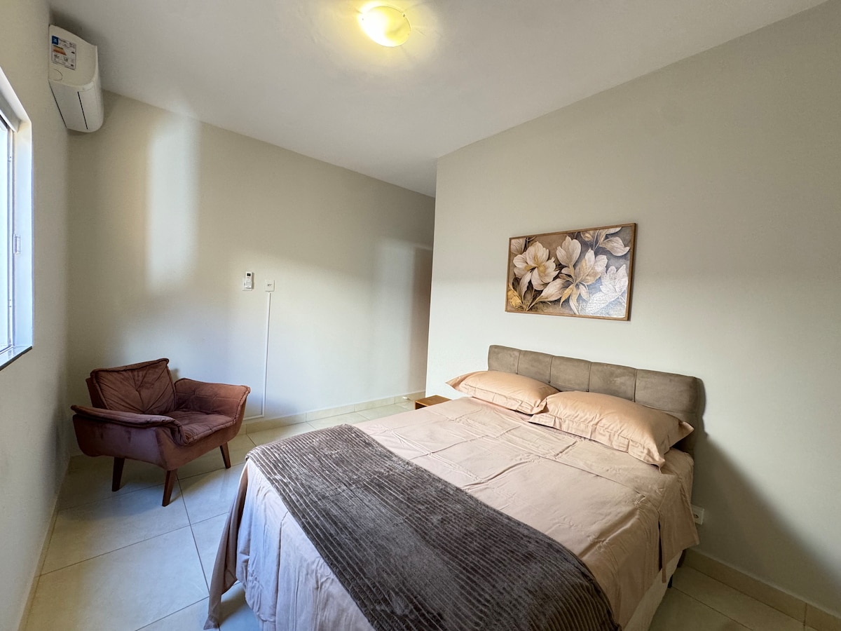 Անկախ տուն ՝ ընդհանուր մուտքով 1 երկտեղանի մահճակալ 1 սանհանգույց 1 ննջասենյակ Սենյակի միացում խոհանոցով և լվացքասենյակով Ավտոկայանատեղի մուտքագրում Անվտանգ եւ հանգիստ ընտանեկան տարածք, գերազանց նրանց համար, ովքեր ցանկանում են գալ Uberlândia մասնակցելու դասընթացների, մրցույթներ, կոնգրեսներ, սիմպոզիումներ, կոնվենցիաներ, ցուցահանդեսներ եւ այլն: 50 մ - ից պակաս հեռավորության վրա մենք ունենք սուպերմարկետ, դեղատուն, ռեստորաններ, պիցցերիա, bagolão և խանութներ ՝ ձեզ սպասարկելու համար: