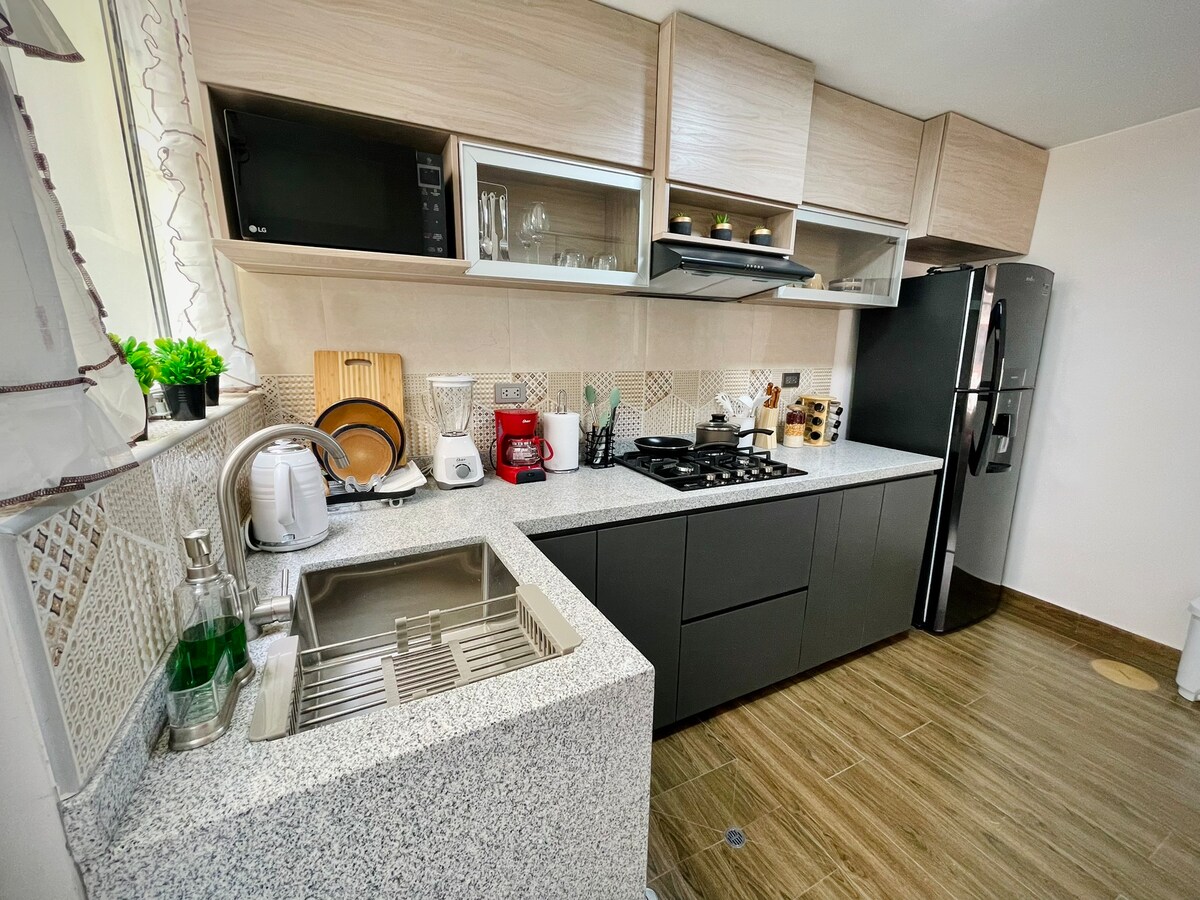 Departamento totalmente equipado en un moderno y exclusivo edificio, ubicado en uno de los distritos más exclusivos y seguros de Arequipa. A pocos minutos de la Plaza de Cayma y rodeado de restaurantes turísticos. Cuenta con TV en sala y dormitorio, cama queen, internet de alta velocidad, agua caliente, cocina equipada, además de shampoo, jabón y amenities necesarios para una estancia cómoda. Fácil acceso a transporte público desde la puerta del condominio.