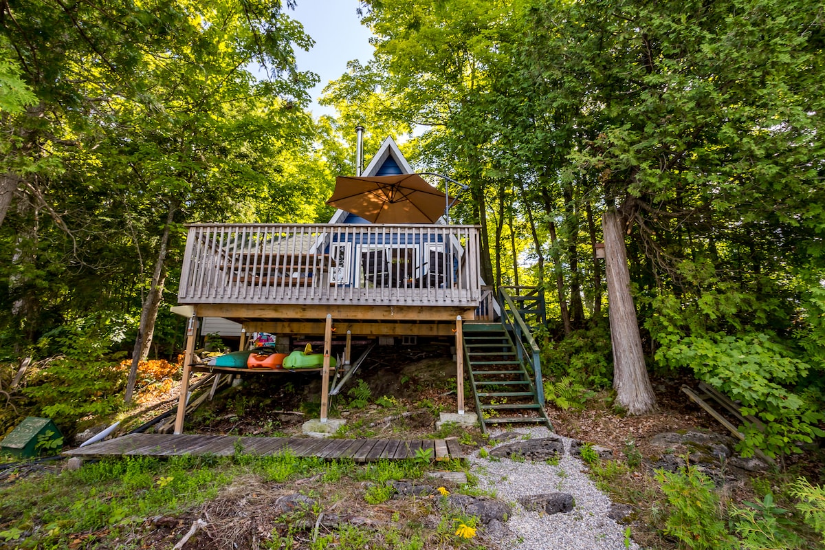 Custom-built year-round retreat in the Frontenac Arch, nestled in the woods—private, quiet, and steps to the lake for canoeing or SUP adventures. Relax on the deck under the stars or soak in the hot tub after a day of adventure. Enjoy vaulted ceilings, soaring windows, a wood stove, outdoor fire pit, custom kitchen, heated floors, rain shower, clawfoot tub, and a bright open layout. 25 mins to Frontenac Provincial Park and 40 mins to Kingston.