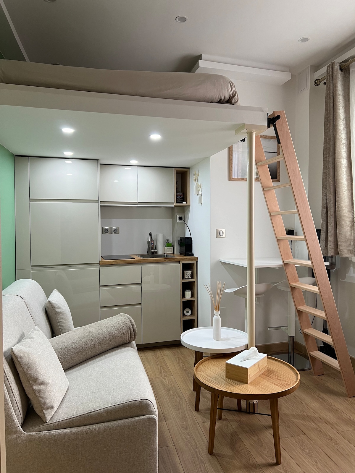 Վերին հարկի ապաստարան ՝ մեծ, արևոտ պատշգամբով և Էյֆելյան աշտարակի անխոչընդոտ տեսարանով ։ Դիզայների կողմից նոր վերանորոգված ՝ այն ունի իտալական ցնցուղ, հարմարավետ երկտեղանի մահճակալ և որակյալ թախտ 3 -4 հոգանոց խմբերի համար ։ Պայծառ բնակելի/ճաշասենյակ, արագ լայնաշերտ կապ և Netflix ։ Ապահով շենք աշխույժ թաղամասում ՝ լի սրճարաններով, ռեստորաններով և խանութներով ։ Մետրոյի կայարան ՝ ընդամենը 2 րոպե ոտքով ։ Կատարյալ է զույգերի, ընկերների կամ գործնական այցերի համար ։