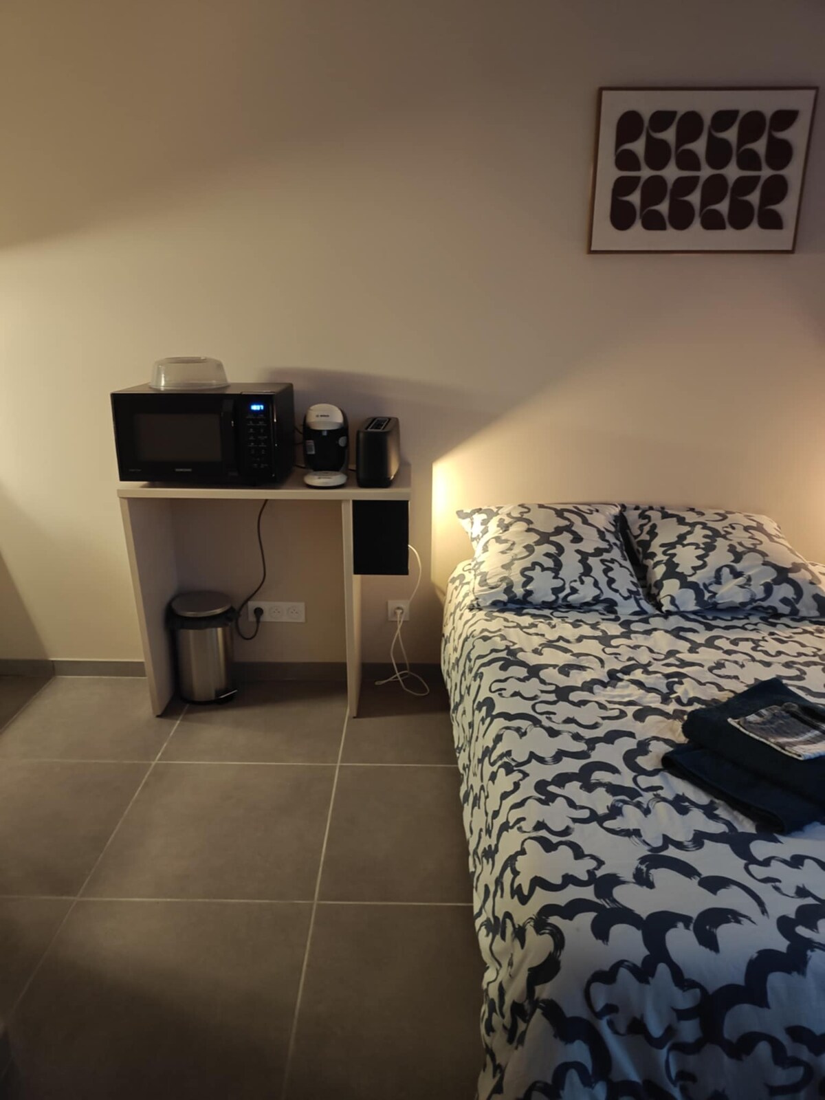 Թարմ վերանորոգված բնակարան փոքրիկ շենքի 3 - րդ և վերին հարկում ՝ նավահանգստի վրա, Մայենի ափին և քաղաքի կենտրոնի ստորոտում, և դրա բոլոր հարմարությունները ։ Բնակարանը բաղկացած է մուտքից, որտեղ կարող եք պահել ձեր ուղեբեռը, հյուրասենյակը (սեղան, 4 աթոռ, հեռուստացույց, 140 * 200 մահճակալ, պահարան), խոհանոցիկից (ջեռոց, վարագույր, ինդուկցիոն սալօջախ, Սենսեո,...) և լոգասենյակից (ցնցուղ, լվացարան, զուգարան, սրբիչի չորանոց):