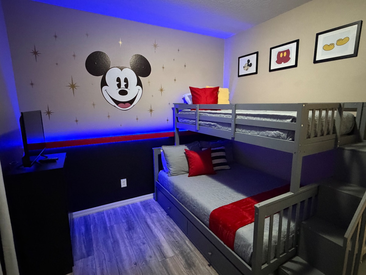 Appx. 5 րոպե Դիսնեյի համաշխարհային պարկերից և բոլոր մյուս թեմատիկ զբոսայգիների և ցուցահանդեսների կենտրոնի մոտակայքում (ամենօրյա անվճար փականներով դեպի/թեմատիկ զբոսայգիներից և առևտրի կենտրոններից): Ցնցող 6 մահճակալ/5 լոգասենյակ 5 աստղանի տուն ՝ Top Resort տիպի հարմարություններով և առանձին բակային լողավազանով/ջակուզիով և խաղային սենյակով: Մենք ունենք 2 բացառիկ թեմատիկ սենյակներ, ՈՐՈՆՔ ՄԱՆԿԱԿԱՆ ԵՐԱԶԱՆՔ ԵՆ: Սա պրոֆեսիոնալ հարդարված է և ներառում է լավագույն որակի ներքնակներ, կահավորանք, սարքավորումներով հագեցած, մեծ հարթ էկրանով հեռուստացույց բոլոր ննջասենյակներում:
