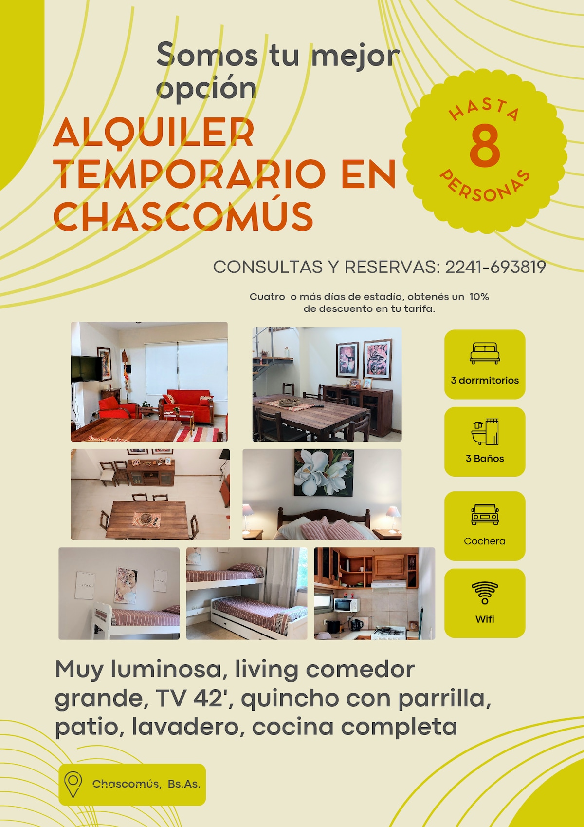 Բացառիկ տարածք ամբողջովին ձեզ համար ՝ 8 x 4 մետր լողավազանով, գրիլով և մեծ պարտեզով ։ Շինարարությունը նոր է, ունի օդորակիչ, 32դյույմանոց հեռուստացույցի օդափոխիչներ, ջեռուցիչներ, ամբողջական խոհանոց և ֆրեզերային սառնարան ։ Վայելեք Chascomú - ի հանգստությունը բնության և արևի միջավայրում: Թաղամասը լուռ է ՝ հինգերորդ տներից ՝ կեղտոտ փողոցներով և ընդարձակ պուրակով ։ Մեր ծառայությունների մասին ավելին իմացեք ստորև տրված նկարագրության մեջ ։ Եթե հարցեր ունեք, մենք պատրաստ ենք խորհուրդ տալու ։