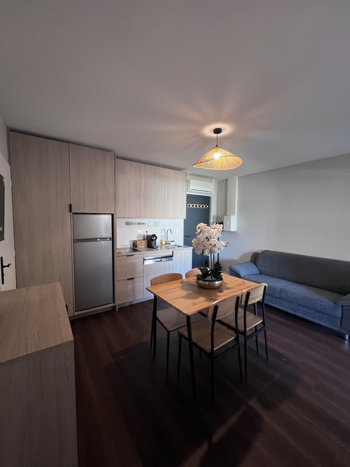 Détendez-vous dans ce logement calme et élégant. Appartement moderne T2 dans un immeuble récent avec une chambre, un lit double, un bureau, un salon, une cuisine ouverte, salle de bain avec toilette lave linge La cuisine est entièrement équipée(frigo, micro-onde,plaque de cuisson,hotte, four,lave vaisselle et grille pain. Un coin bar café et thé. Le salon dispose d'un canapé en cuire convertible 2 places, une télé, Netflix et wifi haut débit. Parking gratuit. Accès à toute commodités à pieds