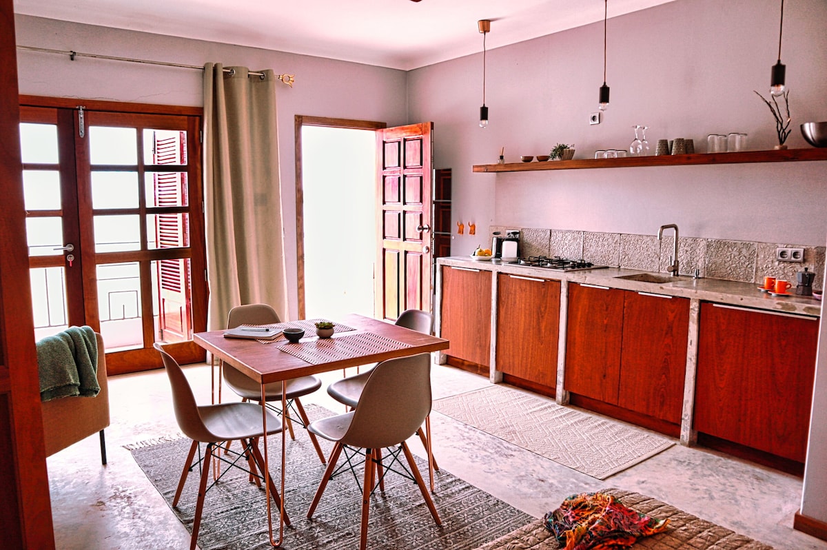 Chic, surf-inspired cozy apartment nestled in the old Mediterranean building Casa Velha. Small yet charm, two-level apartment offers well-equipped kitchenette and private, spacious bathroom with shower. The high ceilings with the stylish palm mural and surf boards gives a touch of contemporary flair. One of the highlights is an access to a charming patio with palm tree and to the rooftop terrace, where you can enjoy panoramic views. 5 min to the beach, the sun, sea, and nearby surf schools.