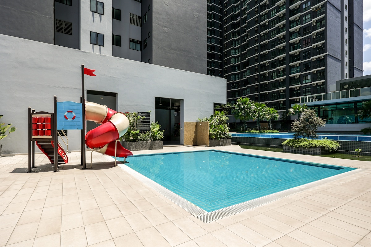Pertama Residency is located in Taman Kobena, Cheras, KL a 6-minute walk from MRT Pertama Station. The apartment has a Swimming Pool, Outdoor Jacuzzi, Reflexology Foot Path in the Garden, Children's Playground, Sauna and Gym. Inside, the fully air-conditioned apartment offers free WiFi, Netflix, a 120" projector screen with Dolby Audio and a 55" TV. It also features a fully equipped kitchen with a fridge, a seating area, a washing machine, and a bathroom with a jacuzzi hot tub and shower.