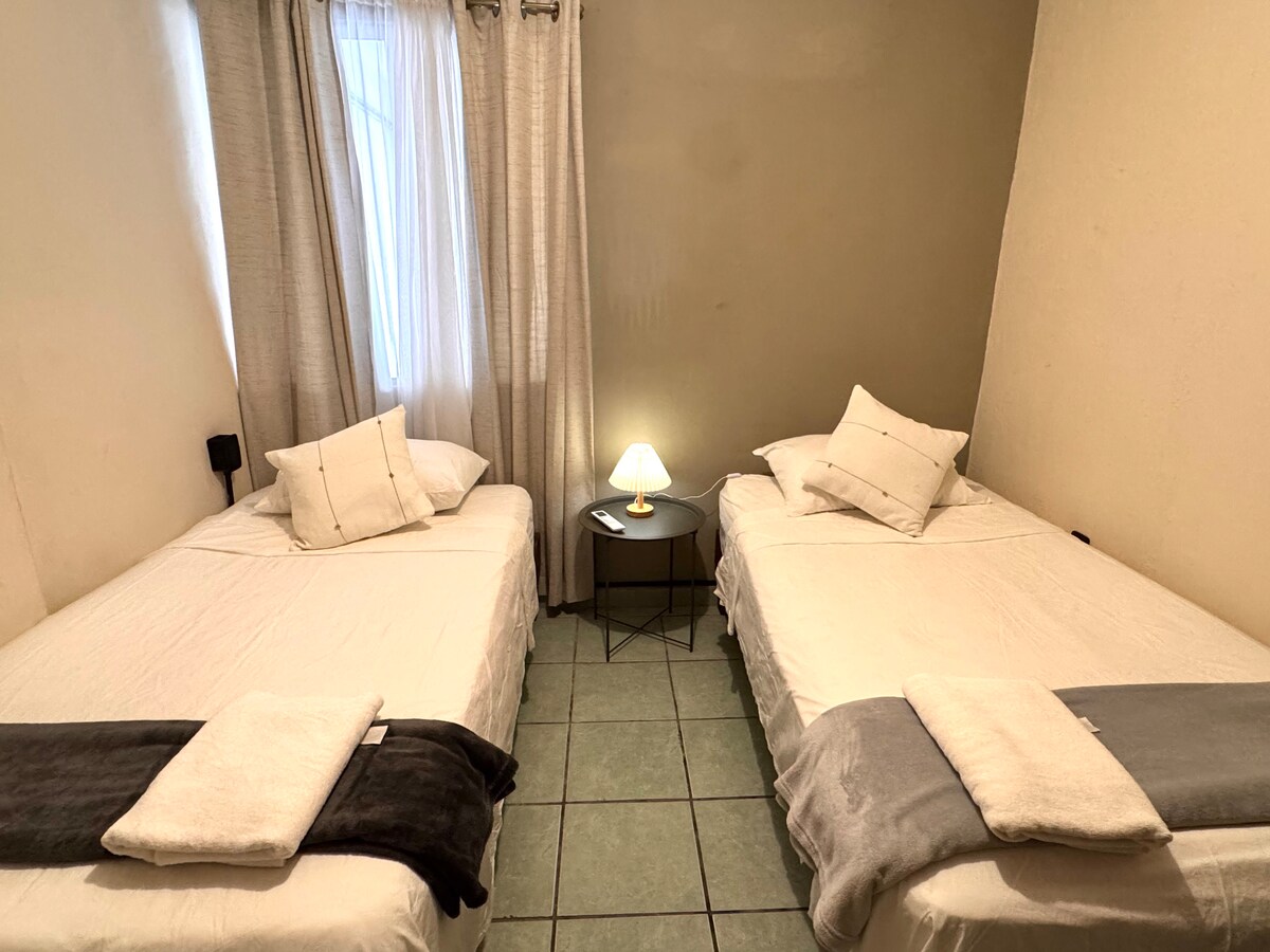 Amplio Departamento de dos plantas a solo 5 cuadras de la concurrida calle Real de Guadalupe. Se encuentra en una propiedad muy segura y con vista a un hermoso jardín. Cuenta con 1 cama king size, 1 cama matrimonial, sala de tv, baño con vestidor, cocina equipada, sala con chimenea, internet WIFI de alta velocidad y una cómoda oficina. Terraza con su mesa, sillas y hamaquero. También cuenta con lavadora y secadora en las instalaciones para uso de los huéspedes.