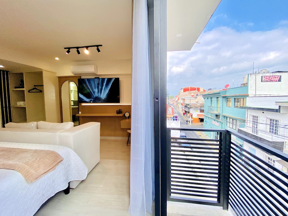 Vive una experiencia de lujo en el corazón de Xalapa. Todo fue pensado para que vivas una experiencia de comodidad, privacidad y lujo. Este departamento de alta gama cuenta con cama queen, cocina integral, balcón con vista al vecindario, baño completo, aire acondicionado y una TV de 65". Controla el clima, las luces ambientales y el entretenimiento con tecnología inteligente. ¡Tu estancia perfecta te espera!