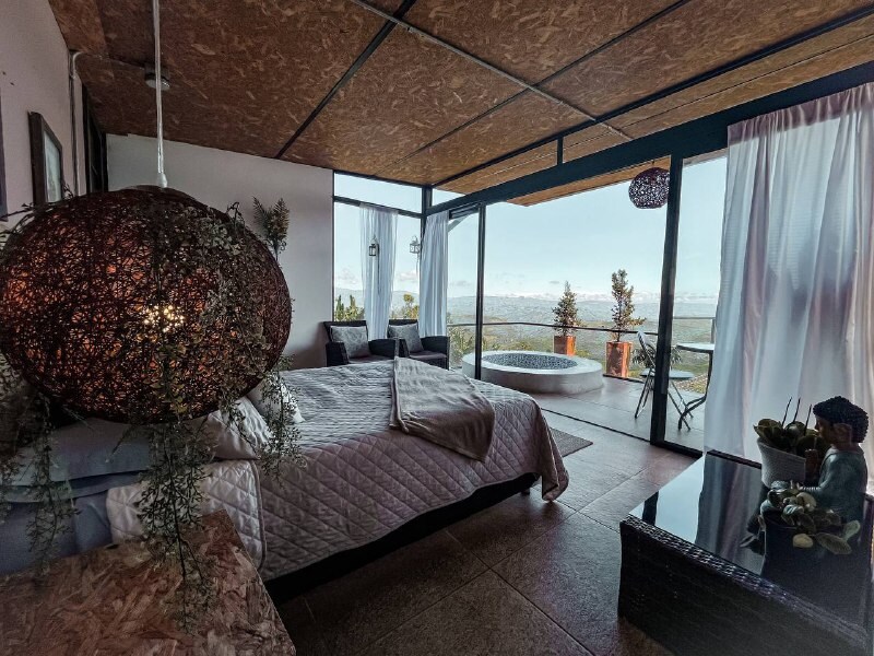 Acanto es un alojamiento de tipo alpino por su estructura triangular de dos niveles. En el primer piso encontrarás el jacuzzi, la cocineta, el baño y la zona de estar, y en el segundo piso el área de habitación con la malla de catamarán. Este alojamiento es el mas alejado de todo el grupo sobre una pequeña pendiente desde donde podrás admirar el paisaje y toda la zona.