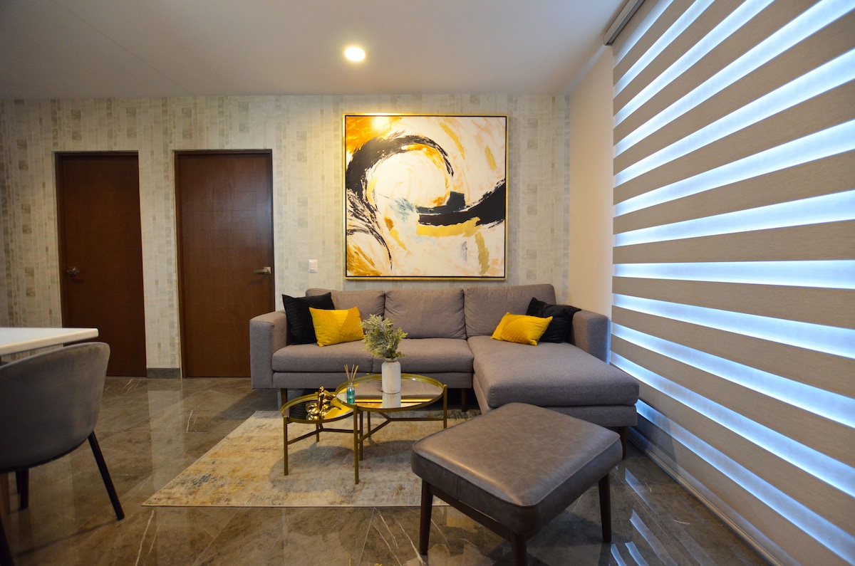 1 ննջասենյակով բնակարան, 1 լոգասենյակ, բազմոց, շատ հարմարավետ ծալովի մեկտեղանի մահճակալ, կահավորված քվարցային խոհանոց, լվացքատան կենտրոն, սրճարան ՝ իրենց համապատասխան պարագաներով, Wi - Fi, պատշգամբ, որտեղից բացվում է Parque Fundidora և Arena Monterrey: Այն ունի մարզասրահ, բացօթյա տարածք, խաղասենյակ, համատեղ աշխատելու տարածքներ և գրիլներ (վերջինս նախատեսված է մաքրման փոքր վճարի համար )։ Քայլեր դեպի Մոնտերեյի լավագույն տեսարժան վայրերը ։ Խնայեք ժամանակ և գումար ՝ մնալով Depa Arena - ում և Fundidora - ում ։
