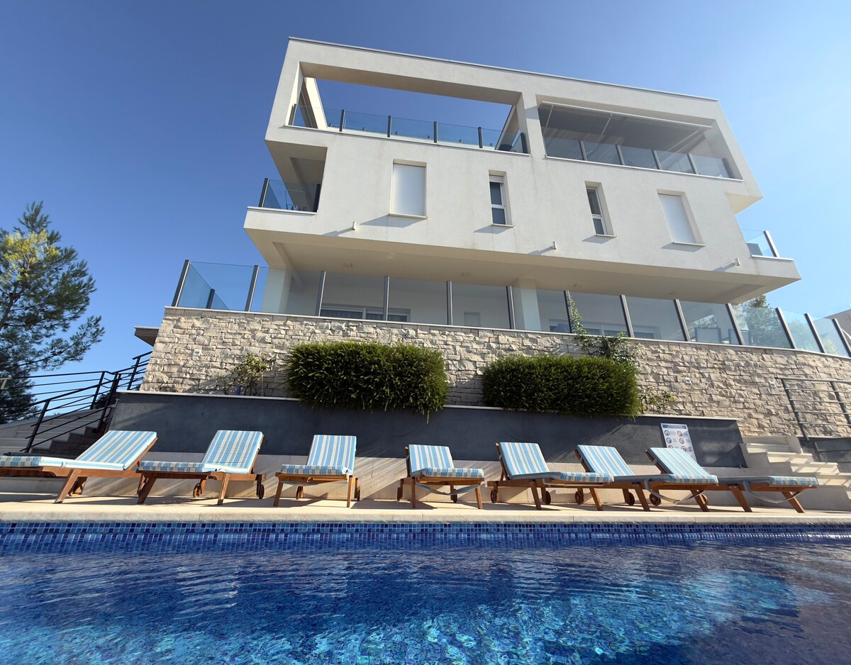 Սա կատարյալ, նոր, ժամանակակից, շքեղ կահավորված 4 աստղանի վիլլա է ՝ առանձին լողավազանով, նրանց համար, ովքեր ցանկանում են առանձնանալ, վայելել խաղաղությունն ու հանգիստը, բայց միևնույն ժամանակ գտնվում են պատմական քաղաքի կենտրոնից ընդամենը 10 րոպե հեռավորության վրա: Վիլլայից բացվում է հիասքանչ տեսարան դեպի Ադրիատիկ ծովը և Տրոգիրի աշխարհահռչակ հին պատմական կենտրոնը: Ամբողջ վիլլան և սեփականությունը մեկուսի են ։ Պարզ ասած ՝ սա երեկույթների տուն ՉԷ բարձրագոչ մարդկանց համար ։ Եթե հնարավոր է վաղ ժամանում, դա ԼՐԱՑՈՒՑԻՉ ՎՃԱՐ է:
