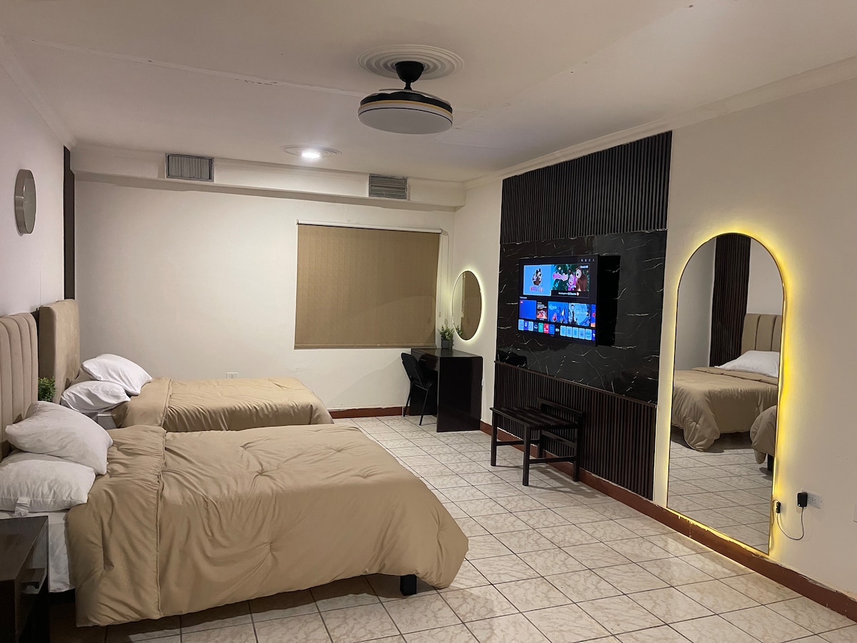 🛌 Cama queen size con 4 almohadas ✨ Diseño minimalista, limpio 📍 Ubicación céntrica en avenida principal 🚀 WiFi rápido ideal para trabajo remoto 📺 TV con Netflix incluido 🛋️ Sofá cama con canguro (comodidad extra) 🎵 Bocina iHome para música, con carga inalámbrica y Puerto USB 😌 Ambiente tranquilo 🚿Agua caliente 24hrs 🧊 Frigobar con congelador
