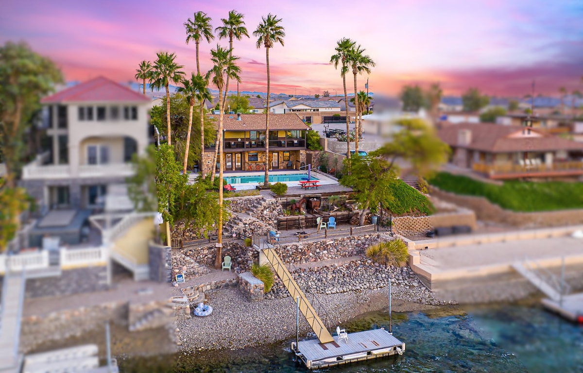 Beautiful waterfront home with private boat dock, elevator, jacuzzi and full size bar/lounge. This is the closest waterfront rental home nearest the Laughlin Casinos and Lake Mohave. Walking distance to restaurants, bars, gas stations and grocery stores. Luxury home with brand new furniture throughout. Built-in backyard BBQ island. Upstairs is the main living area, kitchen, 3 bedrooms and 2 full bathrooms. Downstairs is a huge bar/lounge with a sofa bed for extra sleeping. 2750 sqft of luxury.