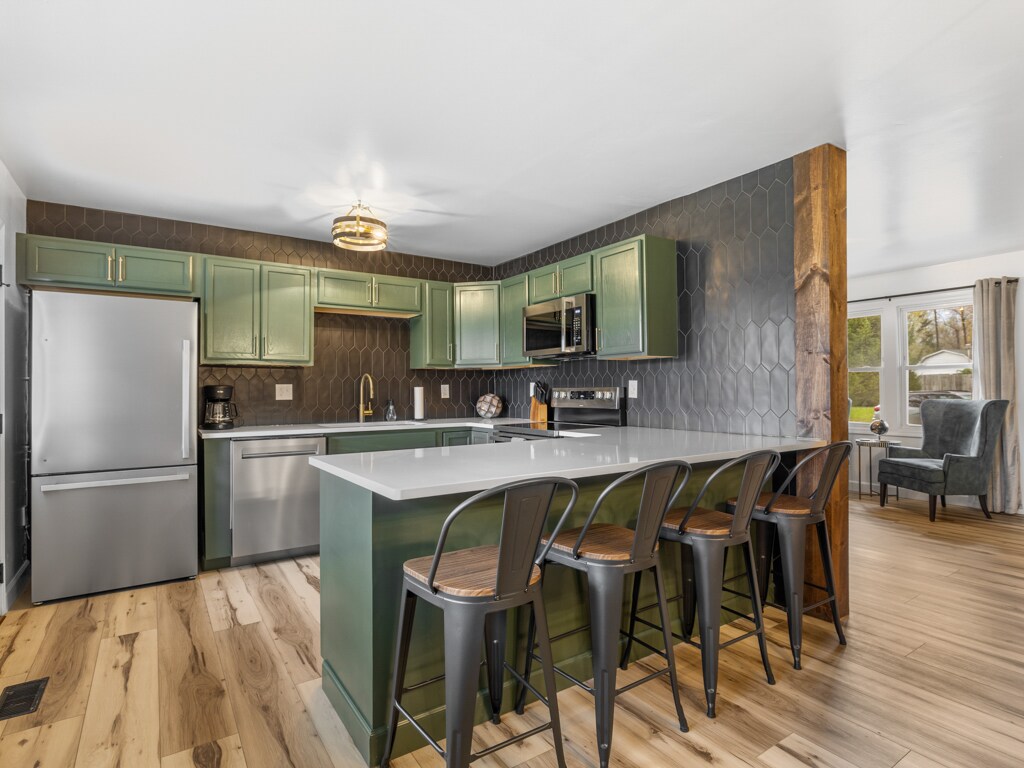 Այս յուրահատուկ վայրն ունի իր ոճը ։ Այս տունն ամբողջությամբ կահավորված է փայտե հատակով ։ Կա երկու ննջասենյակ ՝ երկտեղանի մահճակալներով, շատ պահեստային և սենյակային մուգ շերտավարագույրներով ։ Ներքևում կա լվացքի մեքենա և չորանոց, իսկ երեխաների համար ՝ խաղասենյակ ։ Հյուրասենյակում բազմոցը կարող է պոկվել մահճակալից, իսկ ներքևում ՝ խաղասենյակում, ֆուտոն կա ։ Հետնաբակն ամբողջությամբ ցանկապատված է ։ Union Hospital - ի, ISU - ի և բազմաթիվ տեղական ռեստորանների ու խանութների մոտ: