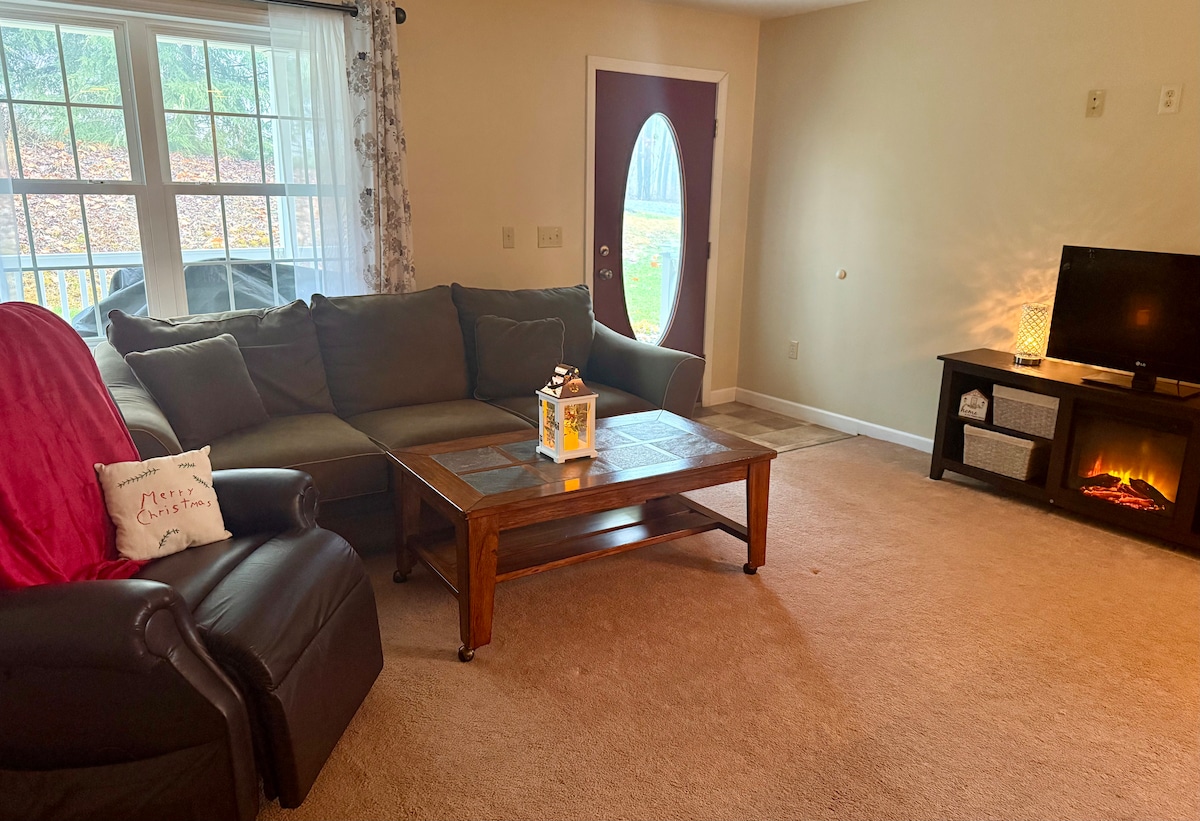 Enjoy your visit in the cheery and bright basement of my home where you have a private entrance, separate parking, full kitchen area, (just bought new stove/oven) access to a quiet patio area that has been newly added, gas grill available and lots of greenery and woods in the backyard. I am one mile to the beautiful town area where you can enjoy our riverwalk, access restaurants, shopping is convenient as well. If your a Penn State fan I am 46 minutes away ( 41 miles). Thanks Sher