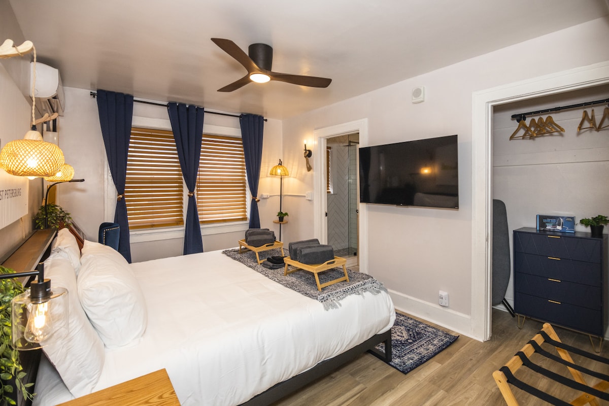 1888 թվականի հյուրանոցը ողջունում է ձեզ Սանկտ Պետերբուրգ Ֆլորիդայում: Այստեղ դուք կգտնեք քաղաքի պատմական շրջանի նպաստող կառուցվածքը. վերականգնված ՝ 21 - րդ դարի ձեր բոլոր կարիքները բավարարելու համար ։ Այս հարկաբաժինը երկրորդ հարկի King 1Bed/Ba հարկաբաժին է ։ Այն գտնվում է քաղաքի կենտրոնում, բայց քաղաքի և պատմական հին հյուսիսարևելյան թաղամասի սահմանին ՝ ապահովելով մոտիկից քայլելու հնարավորություն դեպի քաղաքի եռուզեռը, բայց ապահովում է հյուրանոցային հաճելի հանգիստ միջավայր ՝ Կենտրոնական պողոտայից հեռու: