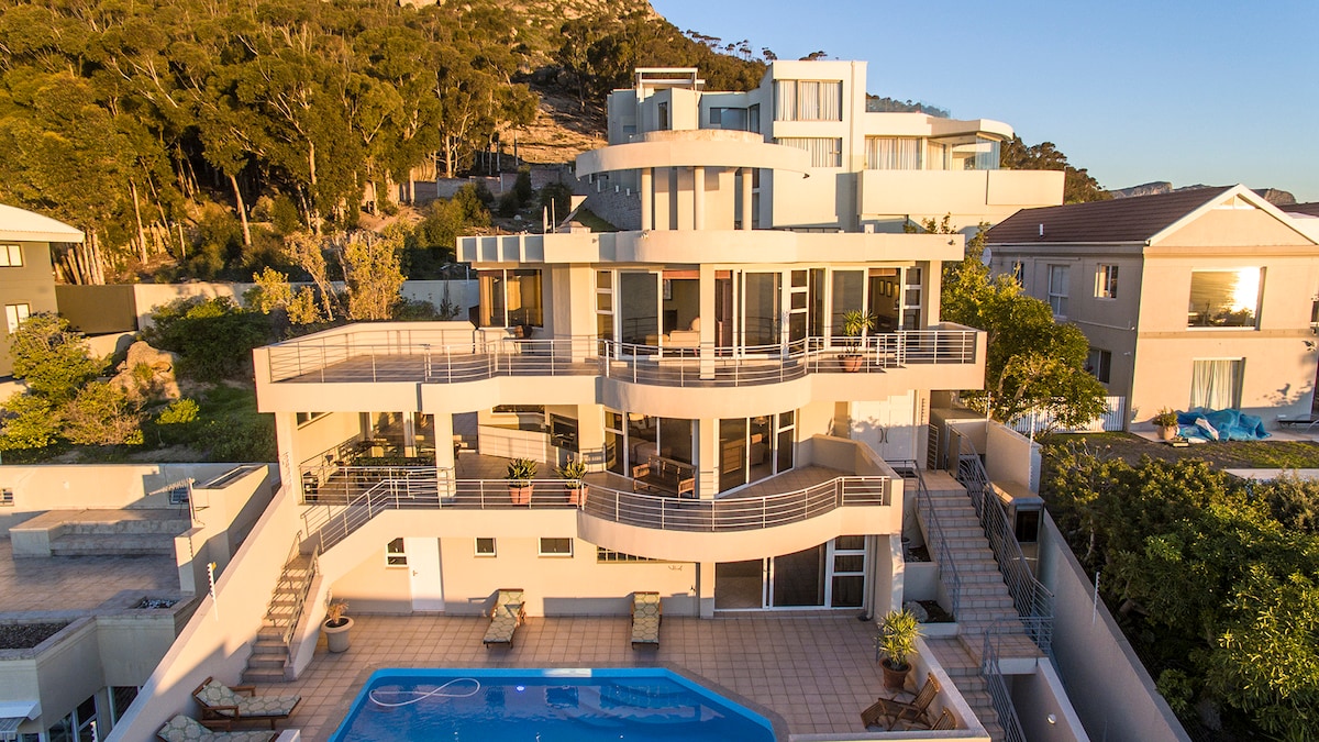 High up against the world famous Lions Head lies a magnificent 5 Bdr, 5.5 bath Villa that overlooks Bantry Bay, Seapoint and Mouilli Point. The villa is the definition of home living with a view to die for and located in the luxurious Bantry Bay area. With amazing mountain and ocean views the villa with pool hosts tons of space and a terrace on each level ensures that you will always have a spectacular view. Backup power, uncapped WiFi, DSTV, AC in all bedrooms, armed response, & secure parking.
