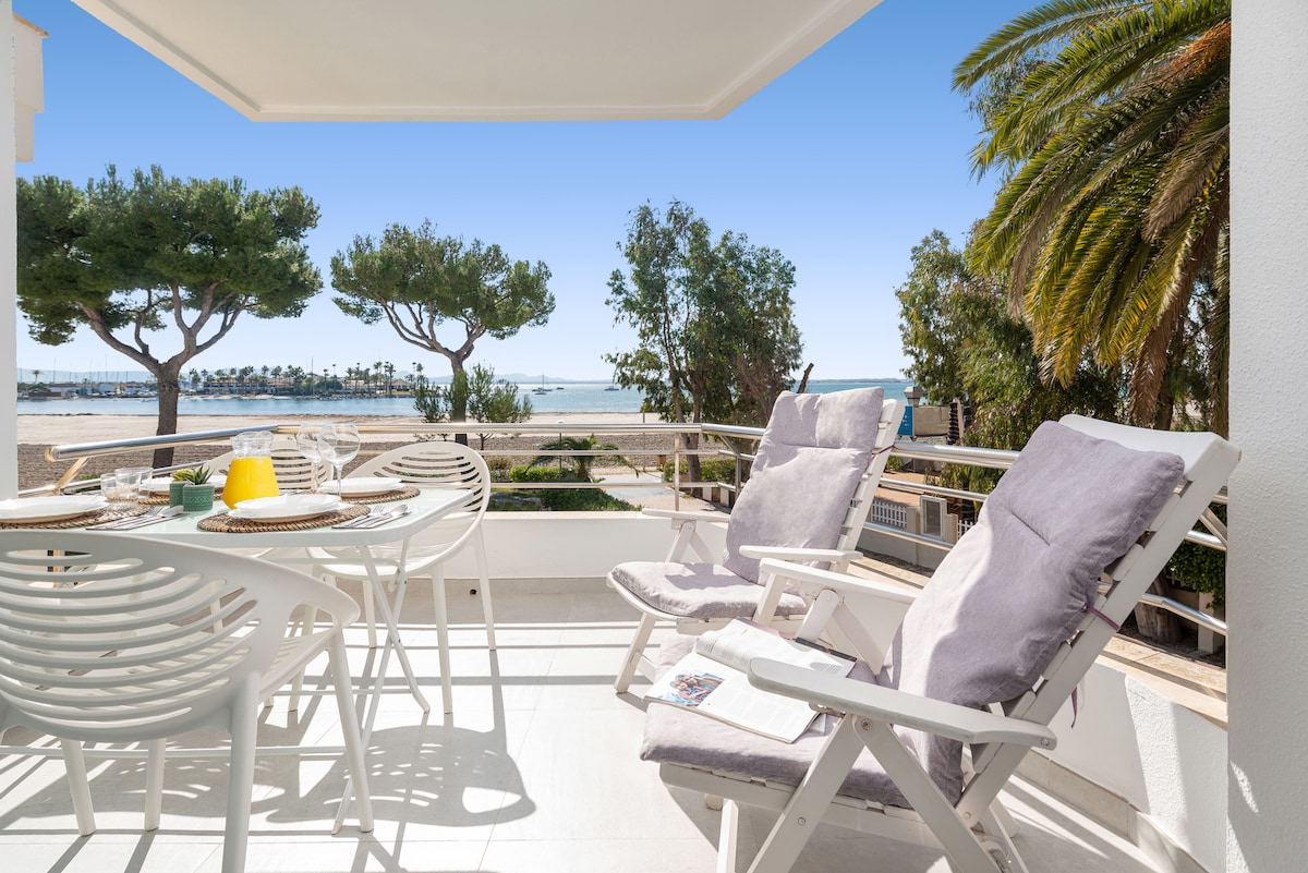Bonito apartamento con excepcionales vistas al mar. Situado sobre la playa de arena de la Bahía de Alcudia. Cuenta con dos habitaciones dobles: una con cama doble y una con dos camas individuales. Además disponemos de un salón-comedor con acceso a una terraza con vistas al mar, cocina totalmente equipada, un baño con ducha y un aseo.