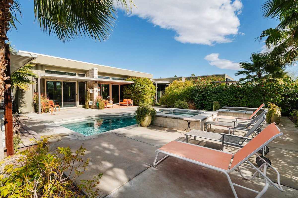 The Palmetto House - A Luxury + Mid - Century Oasis - ը մասնավոր հանգստավայրի նման լողավազանով, կաբանայով, կրակարանով, ջակուզիով և Սան Ժասինտո լեռների զարմանահրաշ տեսարաններով, որը գտնվում է Փալմ Սփրինգսի կենտրոնից մոտ 2 մղոն հեռավորության վրա: 20 - րդ դարի կեսերի այս ժամանակակից տունը նախագծվել է լեգենդար ճարտարապետ Ջեյմս Կիոֆիի կողմից և առաջարկում է ընդարձակ հատակագիծ և անխափան հոսք դեպի լողավազանի տարածք ։ Բարձր առաստաղները և պատուհանները թույլ են տալիս, որ մեծ թվով բնական լույսեր ներթափանցեն օազիս ինչպես ներսում, այնպես էլ դրսում: